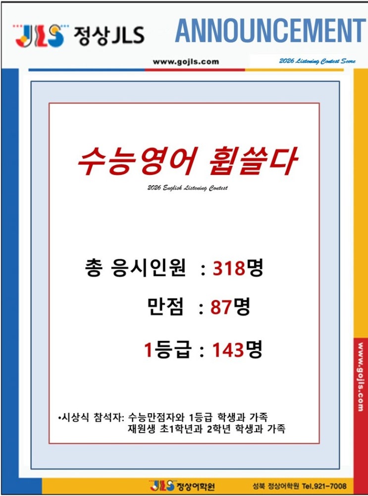 안녕하세요! 성북정상어학원입니다! 11/18(화)~11/19(목) 수능영어듣기 행사를 진행했었습니다! 총 318명이 응시했었으며, 만점자는 87명, 우수자는 143명이 나왔습니다! 이에 아래와 같이 수능영어 시상식을 진행합니다 일시 : 12/4(목), 12/5(금) 시간 : 18:40~20:00 장소 : 성북구 길음로 14-1, 성북성결교회 3층 대예배실 내용 50,000원 식사권 (무료제공) 15만원 상당의 장학증서 (친구 소개 시 적용, 3/31까지 사용 가능) 우수 성적 상장 40센트 만점사 / 1등급 List 개인정보동의서 *학생 수령은 불가하며, 해당 재원생 학부모님만 수령이 가능하오니 참고하시기 바랍니다 어려웠던 시험에도 불구하고 200명 이상의 학생들이 우수한 성적....... <img src="https://blogthumb.pstatic.net/MjAyNTExMjVfNzQg/MDAxNzY0MDUwMTgwMTI2.L4uGyuw6KM0ukBmrgvBjfxKYc5Fggq6qJCDNwDcCKnUg.nD7wvSArL4DER7bHaDn_t5NVqztPyC1__QeK4-Gj3P0g.JPEG/%B1%D7%B8%B21.jpg?type=s3" />