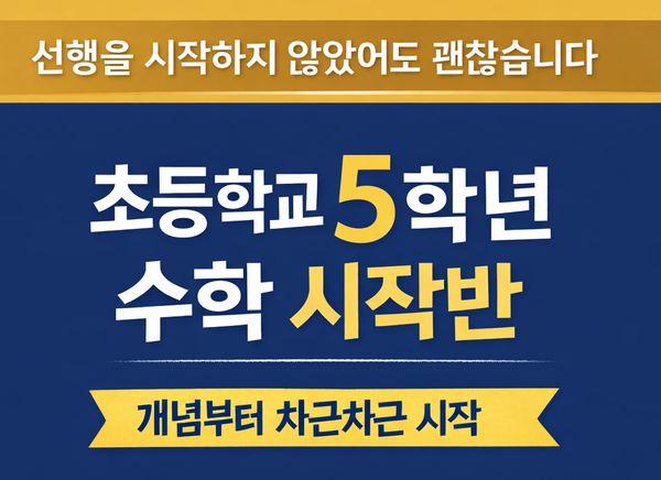 초등학교 5학년 수학 시작반 안내 "아직 선행을 하지 않았는데 지금 시작해도 괜찮을까요?" 상담을 하다 보면 초등학교 5학년을 앞둔 학부모님들께서 가장 많이 하시는 질문입니다. 수학의힘 위례에서는 무리한 선행보다 개념을 정확하게 이해하는 수업을 중요하게 생각합니다. 그래서 이번에 선행 수업을 진행하지 않은 학생들도 진도 부담 없이 시작할 수 있는 초등학교 5학년 신규반을 개설합니다. 개념부터 차근차근 시작하는 수학반 초5 수학은 최대공약수, 최소공배수, 분수의 덧셈 뺄셈 곱셈 과 같은 중요한 개념이 등장하면서 수학 난이도가 크게 올라가는 시기입니다. 이 시기에 개념이 흔들리면 문장제나 응용 문제에서 어려....... <img src="https://blogthumb.pstatic.net/MjAyNjAzMTZfMTc2/MDAxNzczNjU3NjcyNTM3.r6H2JAa5gOZjQr7XBWgBdCOtcciLu4YjB1ljTkavfskg.IGt2YHaxgVIJlbyKuQsHbixj5my1OHvpipi2d4HHGzIg.PNG/%C3%CA5%C7%D0%B3%E2_%BD%C3%C0%DB%B9%DD_%C8%AB%BA%B8%BF%EB_%BD%E6%B3%D7%C0%CF.png?type=s3" />
