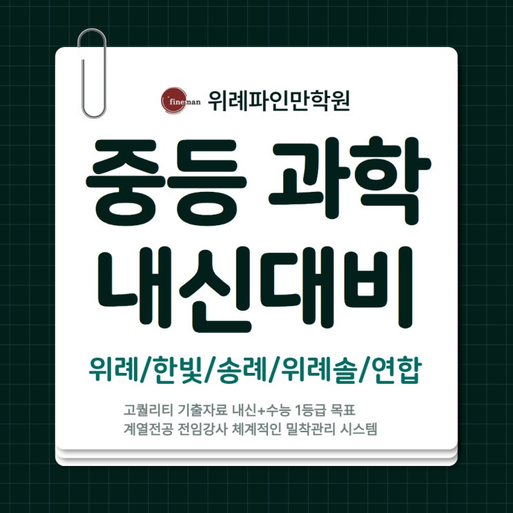 안녕하세요! 위례파인만입니다! 새 학기가 시작되면서 중학교 과학 내신 대비에 대한 문의가 많아지고 있습니다. 특히 중학교 과학은 단순 암기 과목처럼 보이지만 실제 시험에서는 개념이해 + 자료 해석 + 서술형 문제까지 함께 출제되기 때문에 체계적인 대비가 필요합니다. 위례파인만학원에서는 다가오는 1학기 중간고사를 대비한 중등 과학 내신 대비반을 3월 28일부터 순차 개강합니다! 주 1회 3시간 수업 + 개별 클리닉 관리(전임선생님 직접 진행)로 구성되어, 학교별 시험 범위와 유형에 맞춰 준비할 수 있도록 설계되었습니다. 3/25(수), 3/28(토), 3/29(일) 개강 6회 구성 (직전특강 포함) ▼신청링크▼ https://forms.gle/BMPZo7NfCM....... <img src="https://blogthumb.pstatic.net/MjAyNjAzMTBfMTE0/MDAxNzczMTQ0MDc2OTE1.h8lWgbefiZCQ3vQ2wKgkyeXrOBXHOdIhzMUOzj_m2iMg.ZzhQOyflfNTd0gLltd4tGvzBm4ubH2KjNNtca9yYxWEg.JPEG/%C0%A7%B7%CA_%B0%FA%C7%D0%B0%FA_%BD%E6%B3%D7%C0%CF_%BB%F9%C7%C32.jpg?type=s3" />
