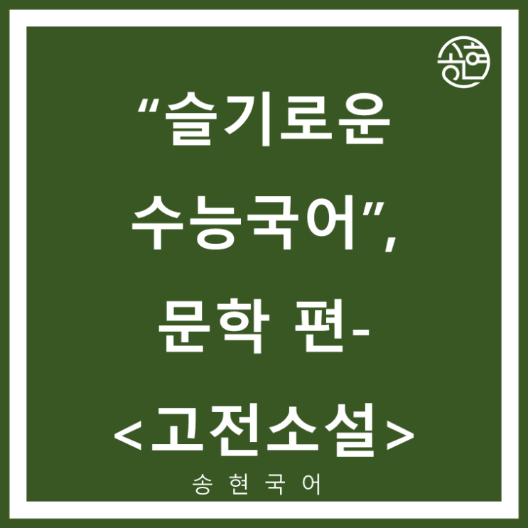 위례국어는 송현학원!! 안녕하세요. 송현학원입니다.^^ 오늘은 <슬기로운 수능 국어>, '문학 편' 중 고전소설에 대해 알아보겠습니다. 고전소설은 말그대로 오래 전에 쓰인 소설을 뜻하며 익숙하게 들어본 흥부전, 심청전 등을 예로 들 수 있습니다. 그 외에도 다양한 고전소설이 존재하며 현대소설과 함께 수능국어에서 자주 다뤄지는 분야입니다. 고전소설은 오래 전에 쓰인 만큼 현대소설과는 다른 이야기 방식을 사용하고 있습니다. 기본적으로 큰 틀에서 바깥에 있는 사람이 이야기 속 인물을 바라보는 전지적 서술자 시점으로 진행되며, 서술자적 논평이라는 서술자의 생각과 평가가 소설의 한 부분으로 들어가 있습니다. ....... <img src="https://blogthumb.pstatic.net/MjAyNjAzMTNfMjg5/MDAxNzczMzY4NDE5NjE1.tp64X2KcmFNqFaqPGTshzdMLabKE6d99PJUXj7QEGEAg.9w2Ac5gfB4MK4YaW1E9Kcc7j9GjakJXoUZHKqbFM-5Mg.PNG/%BC%DB%C7%F6%B1%B9%BE%EE_%BD%E6%B3%D7%C0%CF_2.png?type=s3" />