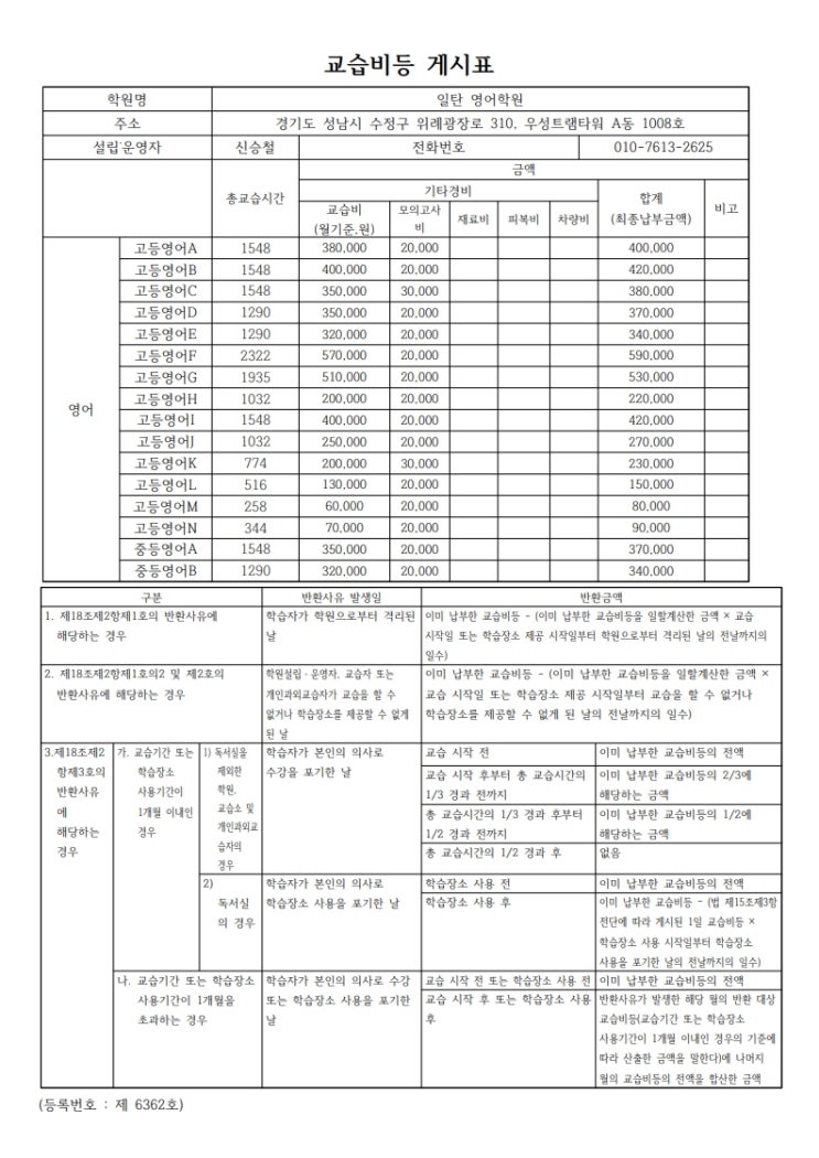 교습비 및 수강료 반환 기준