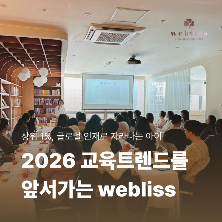 2026년 올해 처음으로 초등 신입생 수가 30만 명 아래로 떨어졌습니다. 단순히 아이들이 줄었다는 것에만 초점을 맞출 것이 아니라 평가 방식 변화를 살펴봐야 할 시점입니다. 2026 교육트렌드가 AI 시대의 흐름과 변화에 맞춰 아이 한 명 한 명에게 집중할 수 있는 디테일한 서•논술형 평가 방식으로 전환되고 있기 때문입니다. 위례 명문 초등 교육기관 위블리스는 이러한 교육트렌드를 미리 예상하고 우리 아이들에게 가장 적절하고 효과적인 교육과정으로 대비시키기 위하여 이에 맞춰 아이들을 지도하고 있습니다. 지난 2월에는 이와 관련된 주제로 재원생 학부모님들을 모시고 OT를 진행하였습니다. 이번 오티는 좌석이 한정되어 있어 사....... <img src="https://blogthumb.pstatic.net/MjAyNjAzMTNfMzgg/MDAxNzczNDAyNDIwNjUx.iroV-0HmthV83hs0R8e4s4Ru3v3Ef3cwLPEwycJCHdwg.8j8Ut8_CJdfb1H54XllH5WxJoOYdy3luDFTdUig-lxcg.JPEG/2026_%B1%B3%C0%B0%C6%AE%B7%BB%B5%E5%BF%A1_%BE%D5%BC%AD%B0%A1%B4%C2_%C0%A7%BA%ED%B8%AE%BD%BA_%C0%A7%B7%CA%BF%F8.jpg?type=s3" />