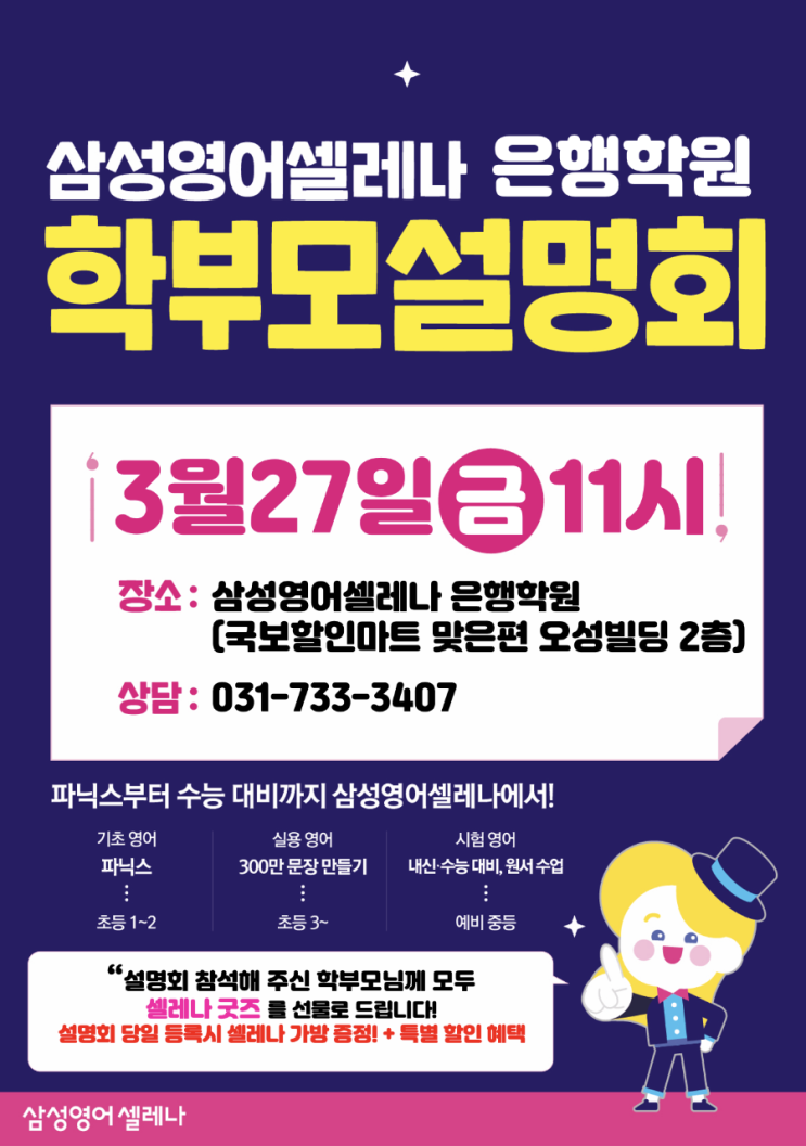 16년 연속 교육 브랜드 대상 수상! 이 숫자가 증명하는 가치는 무엇일까요? 바로 삼성영어셀레나를 믿고 선택해주신 학부모님들의 변치 않는 신뢰입니다. 아이들의 영어가 즐거워지는 마법, 그 비결을 궁금해하시는 학부모님들을 위해 특별한 학부모 설명회를 준비했습니다! 영어가 단순히 '공부'가 아닌 '자신감'이 되는 시간, 우리 아이를 위한 최고의 선택을 제안합니다. 우리 아이 영어 고민, 이제는 확신으로 바꿔드릴게요. [공지] 16년의 신뢰, 결과로 증명합니다! 삼성영어셀레나 학부모 설명회 초청 (3/27) 안녕하세요! 우리 아이들의 무한한 가능성을 믿고 함께 성장하는 삼성영어 셀레나 은행....... <img src="https://blogthumb.pstatic.net/MjAyNjAzMjNfNzMg/MDAxNzc0MjY3NDA0ODU0.8IHZvKtWNUtpIpGqNAFiamxwE1mhSWwQh0eIeOfGCYQg.l6qEBukzjQjoapH0x-7zyepkzYdR34rgL2gHCT0v6Tcg.PNG/900%A3%DF1773848323387.png?type=s3" />