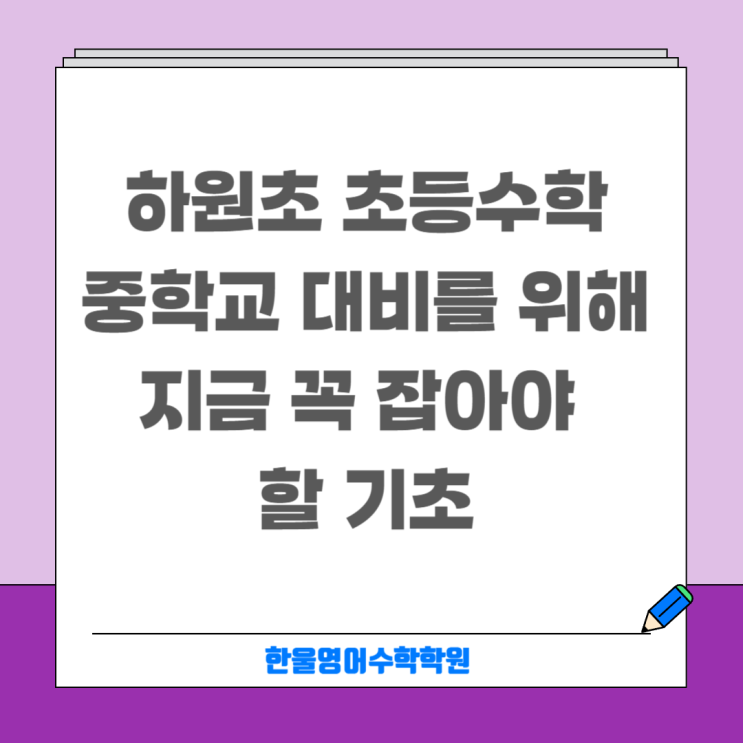 하원초 초등수학, 중학교 대비를 위해 지금 꼭 잡아야 할 기초 새 학기 상담을 하다 보면..." "원장님, 아직 초등학생인데 좀 놀아도 되지 않을까요?" "수학은 중학교 올라가서 본격적으로 하면 되는 거 아닌가요?" 아이를 여유롭게 키우고 싶으신 학부모님들의 그 따뜻한 마음, 누구보다 잘 알고 공감합니다. 하지만 교육 현장에서 매일 아이들을 만나는 사람으로서, 이 질문에 대한 제 대답은 조금 단호합니다. "초등수학, ‘지금’ 단단하게 잡지 않으면 중학교에 가서 아이가 너무 크게 좌절합니다." 초등수학이 중학교 성적의 '결정적 단서'인 이유 중학교 수학 교과서를 펼쳐보면 완전히 새....... <img src="https://blogthumb.pstatic.net/MjAyNjAzMjRfMjY1/MDAxNzc0MzQzMzI5OTI4.31kwGw-QauUyN_3TLkzUpIu7xq1KDs2BxhyiYTOonuog.iTuEBc2nQRBxEPat_VWLktd1NwTcTxIvQb2cjkzw-mQg.PNG/%C7%D1%BF%EF%C7%D0%BF%F8_%BA%B9%BB%E7%BA%BB-012.png?type=s3" />