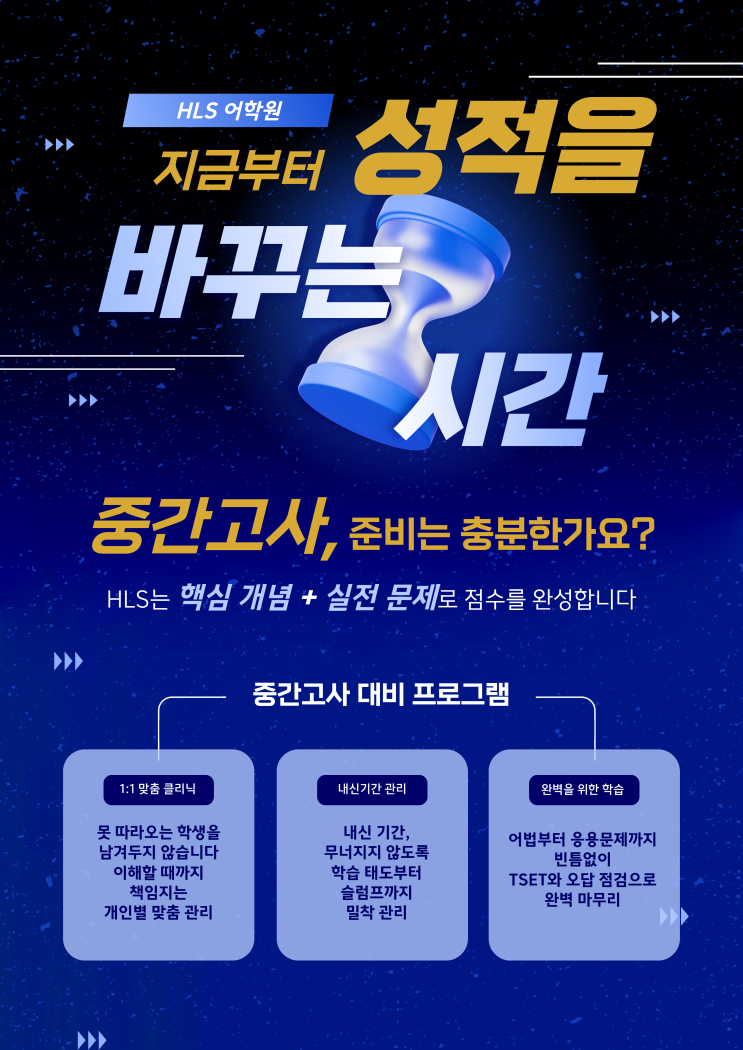 [The Way to the BEST] 안녕하세요! 결과를 약속하는 HLS 어학원입니다. 곧 벚꽃이 피는 계절이 다가오고 있는데요~ “벚꽃의 꽃말은 중간고사”라는 말 알고 있으신가요? 새 학년 첫 시험인 만큼 지금의 학습 습관과 흐름이 앞으로의 성적에 큰 영향을 줄 수 있는 중요한 시기입니다. 중원구 영어학원 HLS 어학원에서는 학생들이 막연한 부담보다는 방향을 잡고 안정적으로 실력을 쌓아갈 수 있도록 체계적인 대비를 시작하려 합니다. 단순히 문제 풀이에 그치지 않고 개념을 확실히 정리하고 반복 학습을 통해 완전히 자기 것으로 만드는 데에 집중할 예정입니다. 또한 학생 개개인의 수준과 학습 상태를 고려한 꼼꼼한 관리와 피드백....... <img src="https://blogthumb.pstatic.net/MjAyNjAzMThfMTcx/MDAxNzczODI0MDE0ODIz.5beRSJ_bAKKx1O77x4dxA9VEZ7Y5msd1ymsx0phHoXsg.7YpVCTzJGyAhW6drra8xEV87IaCLmSxCZIkua3RCaoQg.PNG/1.png?type=s3" />