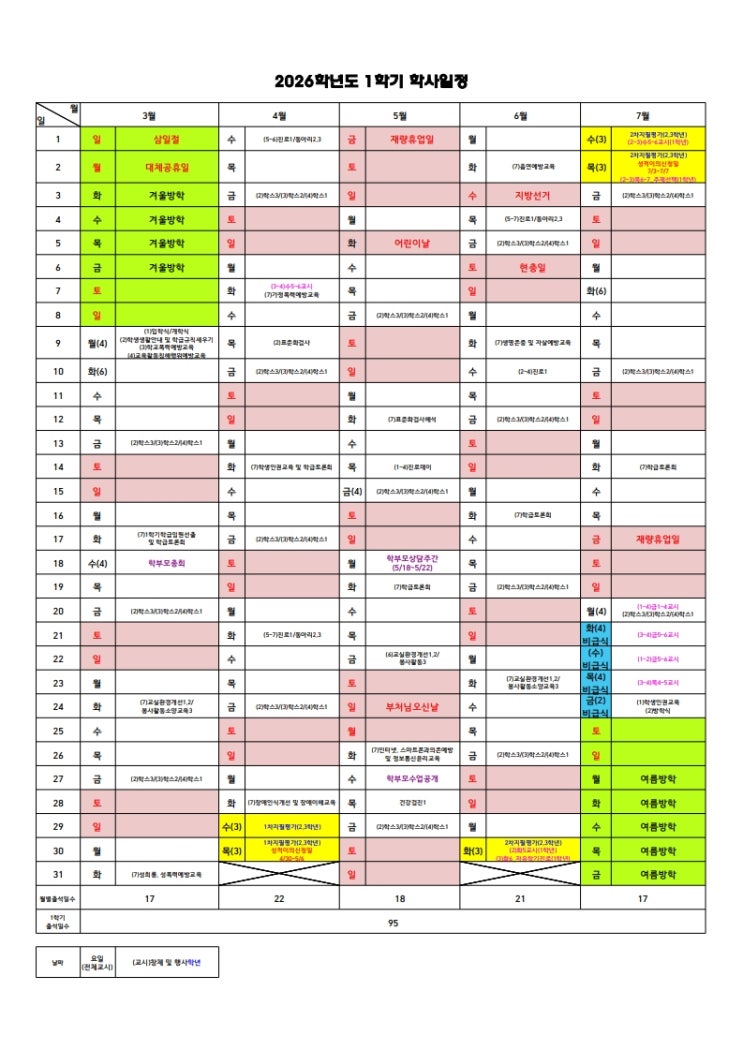 2026 금광중 주요 학사일정을 안내드립니다. 3월 주요행사안내 9일 (월) 개학식 / 입학식 17일 (화) 1학기학급임원선출 및 학급 토론회 18일 (수)학부모 총회 4월 주요행사안내 29일(수) 1차 지필평가(2,3) 30일(목) 1차 지필평가(2,3) 4/30~5/6 성적이의신청일 5월 주요행사안내 1일(금) 재량휴업일 27일(수) 학부모수업공개 28일(목) 건강검진 6월 주요행사안내 3일(수) 지방선거일 30일(화) 2차 지필평가(2,3학년) 7월 주요행사안내 1일(수) 2차 지필평가(2,3) 2일(목) 2차 지필평가(2,3) 21일(화)~24일(금) 미급식 24일(금) 방학식 8월 주요행사안내 24일(월) 개학식 9월 주요행사안내 1일(화) 2학기 학급임원 선출 및 학급토론회 10월 주요....... <img src="https://blogthumb.pstatic.net/MjAyNjAzMjdfMTI5/MDAxNzc0NTg5Mjg5NzQ1.GIZIAL69VN_PLpLw7RABgLNOSwjWRbkW3m5SKLDNkJAg.ej3Ey8SnAPSotYevfmn6igP12UVt68f0mdDxIEHgBW8g.JPEG/2026%C7%D0%B3%E2%B5%B5_%BF%AC%B0%A3%C7%D0%BB%E7%C0%CF%C1%A4%285%BF%F91%C0%CF_7%BF%F917%C0%CF_%C0%E7%B7%AE%C8%DE%BE%F7%C0%CF%29_1.jpg?type=s3" />