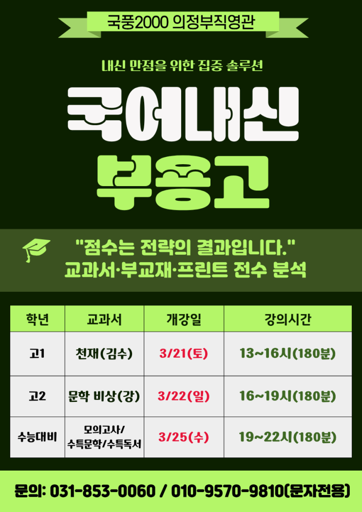 안녕하세요! 교무부장 현식쌤입니다 :) 개학한지 벌써 2주나 지났어요. 어떤가요? 모두 공부 열심히 하고 있나요? 새롭게 개정되는, 또는 처음 고등학교 국어를 준비하는 우리 친구들을 위해 국풍2000 의정부 직영관에서는 부용고 학생들만을 위한 내신대비 클래스를 만들었습니다! 내신대비 3주차에 돌입하면 부용고 국어 내신대비 전문 선생님들께서 직접 감수하고 출제하신 모의 중간고사를 실시! 점수를 바탕으로 예상 중간고사 점수와 등급 상담 앞으로의 학습 방향성도 함께 상담해드립니다. 함께 공부해요! 국어 내신대비의 전통 강자 국풍2000에서 부용고 학생들만을 위한 내신대비 클래스를 경험하세요! 함께 공부하실 분은 031-853-006....... <img src="https://blogthumb.pstatic.net/MjAyNjAzMTJfMiAg/MDAxNzczMjk5MzkwMTA5.9LmQx9e4-AJhgGHzbTzlmuV80ag-srGVZj0m_QIDTsUg.B_lqBZIMuREn8N1Yrt5SIIW3z_AjQ6oV58KVhj7MYvgg.PNG/2.png?type=s3" />