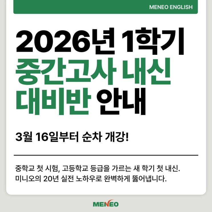 [하안 영어] 2026년 1학기 중간고사 내신 대비반, 3월 16일부터 순차 개강!