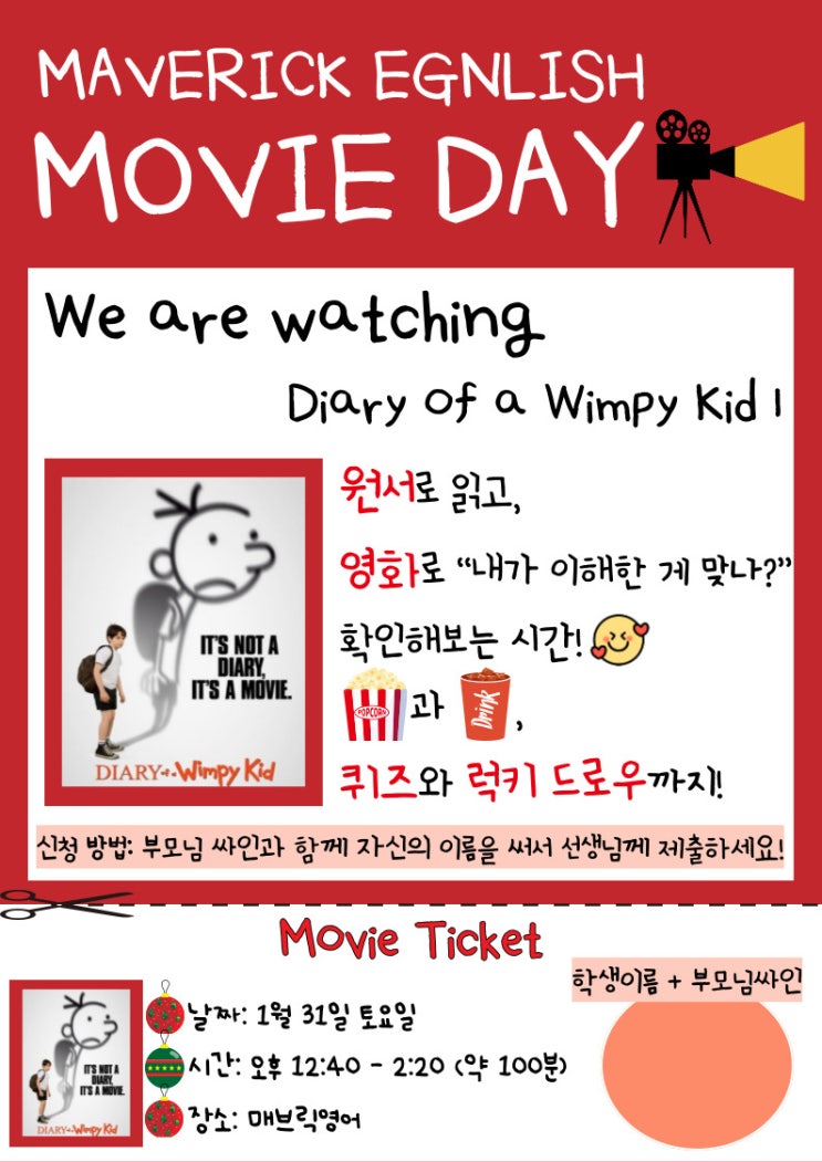 안녕하세요 초등·중등 영어 전문 매브릭영어입니다✨ 오늘 블로그에서는 얼마 전 진행했던 Special Class – Movie Day 후기를 남겨보려고 합니다! 이번 Movie Day는 Diary of a Wimpy Kid 원서를 모두 읽은 후 “이제 실제 영화로 연결해보면 정말 좋겠다!”는 생각에서 시작되었습니다 수업 시간에 항상 성실하게 따라와 준 아이들에게 시험 부담 없이, 즐길 수 있는 시간을 선물해주고 싶었답니다 단순히 영화를 보는 시간이 아니라, 자기가 읽었던 내용과 같은지 수업 시간에 배웠던 표현들이 실제로 나오는지 이런 부분들을 중심으로 보라고 미리 안내해주었습니다. 그래서인지 아이들이 제가 기대했던 것보다 훨....... <img src="https://blogthumb.pstatic.net/MjAyNjAyMTFfMjM0/MDAxNzcwNzk4NDAyMjEy.1rZlLSPtYvApPG8n3AzmWM1Shsy_x_j4xQ4tl5eTHjUg.7dglIwsc6Kk__lTQWTOq38BfBUR3EpNGqMeU7WrMgLkg.JPEG/%C1%A6%B8%F1%C0%BB-%C0%D4%B7%C2%C7%D8%C1%D6%BC%BC%BF%E4_-001_%285%29.jpg?type=s3" />