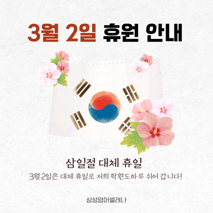 안녕하세요, 삼성영어 화계학원입니다. 새로운 시작의 설렘이 가득한 봄이 다가오고 있습니다. 본원에서는 **3월 2일(월요일)**이 삼일절 대체휴일로 지정됨에 따라, 학 생들의 재충전과 원활한 학원 운영을 위해 아래와 같이 휴원을 결정하게 되었습니다. 삼일절 대체휴일로 인한 휴원 일정을 안내드립니다. ■ 휴원 안내 ■ 날짜: 3월 2일 (월요일) 이유: 삼일절 대체공휴일 정상 수업: 3월 3일 (화요일) 일정 확인하시어 아이들의 등원 및 학습 스케줄에 차질 없으시길 바랍니다. 즐겁고 유익한 연휴 보내세요! 3월 3일(화요일)부터는 모든 수업이 정상적으로 진행됩니다. 우리 아이들이 새 학기를 활기차게 시작할 수 있도록 휴일 동안 충분....... <img src="https://blogthumb.pstatic.net/MjAyNjAyMjdfNDMg/MDAxNzcyMTg0NDY1Njc5.iNBXNYQMUJBnjCBn74lZNwdyCqeCzwl5itim-nX7RHEg.pvsT3WxRAYZIoUPgWoKVdEjzTnz71GAtp0MONy9wyDkg.PNG/3.2%C8%DE%C0%CF.png?type=s3" />