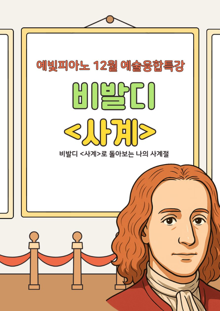 안녕하세요, 예빛피아노에요 12월은 한 해를 마무리하는 달이죠. 아이들과 함께 한 해를 돌아보며 행복했던 기억들을 나누고 싶어 이번 12월 특강을 준비하게 되었어요. 수유초 인근에서 피아노 학원을 찾고 계신 분들께 예빛피아노의 수업 분위기를 조금이나마 보여드리고 싶어 이번 예술융합 특강을 소개해 보려고 해요. 이번 특강은 음악을 들으며 느끼고, 기억을 떠올리며 그림으로 표현해 보는 활동으로 진행했어요. 먼저 비발디의 음악을 들으며 작곡가 비발디에 대해 간단히 알아보고, 계절마다 음악이 어떻게 다르게 느껴지는지도 함께 이야기해 보았어요. 아이들은 각 계절의 음악을 들으며 자신이 떠올린 행복했던 순간을 그림으로....... <img src="https://blogthumb.pstatic.net/MjAyNjAxMjFfNjgg/MDAxNzY4OTczMzY4MTE5.YZjZY9JRUZFCPajxwBXYbv6MZtlYEaYiUCZHZqGDFcog.79nq699N85GUC8EPw8-u7i1J33iQ3Vpr4W8jfAydb_Ag.PNG/KakaoTalk_20260121_131431062.png?type=s3" />