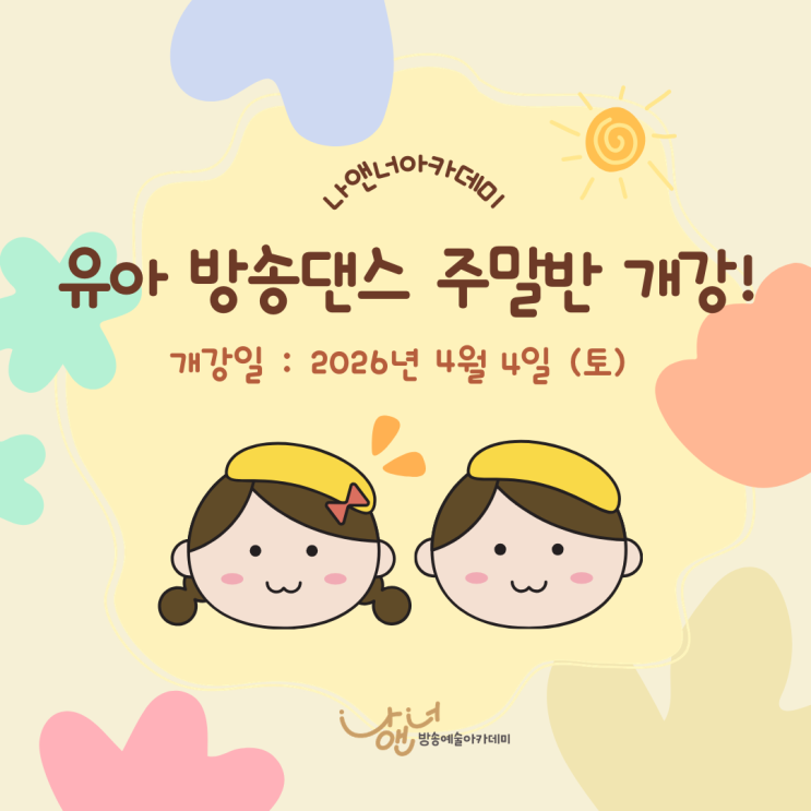 안녕하세요~!! 나앤너 방송예술 아카데미 입니다~ 오늘은 오랜만에 새로운 클래스 개강 소식을 들고 찾아왔습니다~ 우리 아이 첫 댄스 수업, 즐겁게 시작해요! 유아 방송댄스 주말반 OPEN 요즘 아이들을 보면 음악만 나오면 자연스럽게 몸을 움직이며 춤을 추는 모습을 자주 볼 수 있는데요 특히 K-POP 음악이나 유튜브 키즈댄스 영상을 보며 "엄마 나도 춤 배우고 싶어!" 라고 말하는 친구들도 많습니다. 하지만 평일에는 유치원, 어린이집, 학원 등으로 시간 맞추기가 쉽지 않죠. 그래서!! 평일에 바쁜 우리 아이들, 그리고 부모님들을 위해 주말에 편안하고 즐겁게 배우는 ✨유아 방송댄스 주발반 수....... <img src="https://blogthumb.pstatic.net/MjAyNjAzMTlfMTE5/MDAxNzczOTE5Mjk4OTUy.Z57WppMjM8Hld5azq8eI2OQ0misZWTTFc9d0Q9RQNgsg.Oh8P_-qrCz8MLTTKUD-gU2XkfK4_zKLPbtndRfkR5rcg.PNG/%C1%D6%B8%BB_%C0%AF%BE%C6%B9%DD_%B0%B3%B0%AD.png?type=s3" />