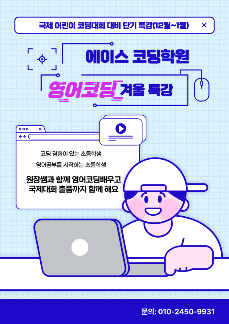 에이스 코딩학원 영어코딩 겨울 특강 다가오는 겨울방학, 우리 아이에게 한 단계 업그레이드된 코딩 경험을 선물하세요! 이번 겨울, 에이스 코딩학원에서는 ‘영어로 배우는 코딩 특강’을 준비했습니다. 코딩 실력을 키우면서 자연스럽게 영어까지 익힐 수 있는 특별한 프로그램이에요. 이런 친구들에게 추천해요! ✔ 코딩 경험이 있는 초등학생 ✔ 영어공부를 시작하는 초등학생 ✔ 국제 어린이 코딩대회 출품을 목표로 하는 친구 원장쌤과 함께 영어로 코딩을 배우고, 직접 만든 작품으로 국제대회에 출품까지 도전해요! 배운 내용을 영어로 설명하고, 작품을 발표하면서 자연스럽게 영어 말하기 실력도 향상됩니다 프로그램 안....... <img src="https://blogthumb.pstatic.net/MjAyNTExMTNfMjE5/MDAxNzYzMDA2ODkxNDAz.Hvg5VrnToT41wfFtWqAYFVxhUuoWJSUg1MHjCN47dUwg.kOexAPZOVeoUr-ZhQk1DkqKlPm95cnIMHujU6665Hbkg.PNG/1.png?type=s3" />