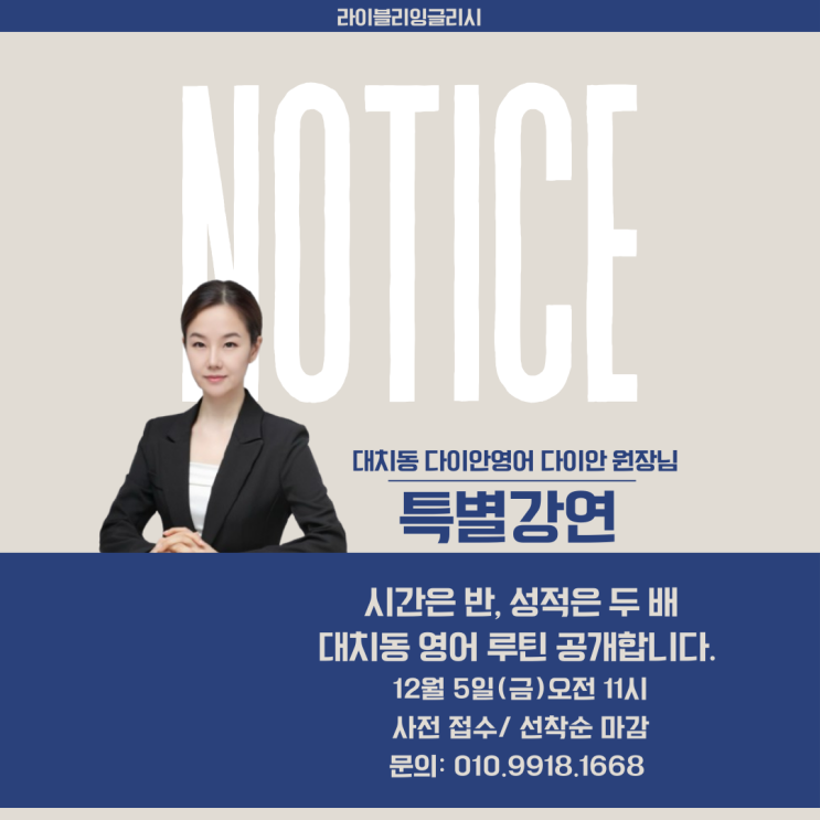 안녕하세요 :) 다음 주 금요일에 동산동 라이블리에서 열리는 좋은 강연 소식을 가지고 왔습니다. 이전 글 '선생님의 연구노트'를 보셨다면, 제가 3개월 동안 대치동 라이팅의 명가 다이안 원장님의 글쓰기 지도사 자격증 과정을 한 것을 아실 거예요. 그 소중한 인연으로 부탁을 드려 이번에 저희 원에 오셔서 특별 강연을 해주시게 되었습니다. 다이안 원장님은 '대치동 초등영어 글쓰기'라는 책으로도 유명하세요. 원장님 과정을 듣기 전에 이미 이 책에서 인사이트도 얻었는지라 원장님과 내적 친밀감이 있었지요. 저번 1:1 미팅 때 책 가져가서 사인도 받았습니다.ㅎㅎㅎ 놓치지 않아요~~ 12월은 학원인들에게는 정말 바....... <img src="https://blogthumb.pstatic.net/MjAyNTExMjdfMTQz/MDAxNzY0MTk4MTgyNDA3.lPX8ia_Hia9tqQYHqO9BG3QwbdaAkRozluYL1wb1KyQg.MbU_5xmWgWDvNDGiZwbDI52MgC_zKoWeOr1nk2TUeJ4g.PNG/%C0%CC%BA%B8%B0%E6%BF%F8%C0%E5%B4%D4%28%B4%D9%C0%CC%BE%C8%29_%28%C0%CE%BD%BA%C5%B8%B1%D7%B7%A5_%B0%D4%BD%C3%B9%B0%29.png?type=s3" />