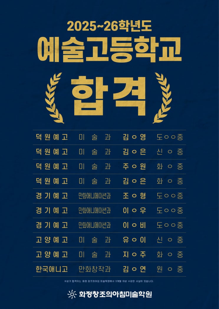 안녕하세요. 화정 창조의아침 미술학원입니다. 2025~26학년도 예술고등학교 입시 결과를 안내드립니다. 올해도 우리 학생들이 치열한 노력과 시간을 쏟아 만들어낸 값진 결실을, 이렇게 기쁜 마음으로 전하게 되었습니다. 경기예술고등학교, 덕원예술고등학교, 고양예술고등학교, 한국애니메이션고등학교와 같이 다양한 학교에 학생들이 당당히 합격하였습니다. 단지 “합격”이 아니라, “과정”의 결과입니다. 예고 입시는 일반 고교 입시와는 다른 성격을 가진 까다로운 과정입니다. 실기력, 관찰력, 표현력, 그리고 꾸준한 자기관리 능력이 모두 요구되죠. 우리 학생들은 그 누구보다 성실하게, 조용히, 그리고 치열하게 자신의 그림을 다듬....... <img src="https://blogthumb.pstatic.net/MjAyNTEyMDVfMTc5/MDAxNzY0OTE1ODQ2NDc2.Vd8P37lp5DnVNa01zec3kLqc1XdOKXEVj8g-kHNCTaAg.ZRfZtoL8hgfg10APpaell02AUbMjPBculpzQpzg-nlog.JPEG/KakaoTalk_20251126_175152571.jpg?type=s3" />