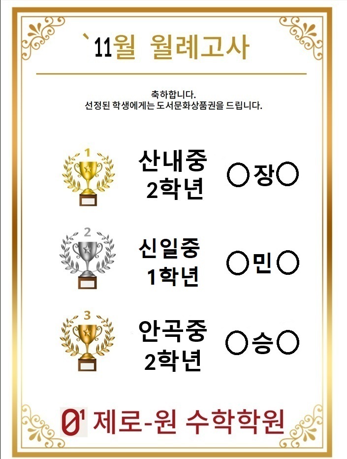 11월 27일(목), 11월 28(금), 11월 29일(토) 3일간 치러진 중등부 우수자 수상입니다. 위학생들에겐 도서문화상품권이 지급됩니다. 축하드립니다^^ <img src="https://blogthumb.pstatic.net/MjAyNTExMjlfMTcz/MDAxNzY0NDIyNzQ4MzY2.2W3x1aLRqck-UbBEENRt4U8U5zXqShEXw2461mdUfW4g.KKfRwM11Kghr4pbysG-dC5OSNIAgy656xViz9A5GCQMg.JPEG/%C1%DF%B5%EE%BA%CE11%BF%F9.jpg?type=s3" />