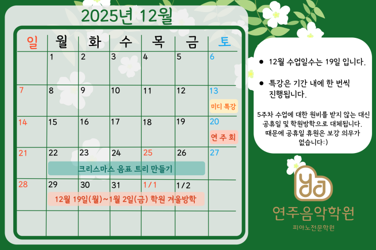 안녕하세요! 연주음악학원 12월 일정 안내드립니다 이번달은 크리스마스 연주회와 음표 트리 만들기가 진행됩니다~!! <img src="https://blogthumb.pstatic.net/MjAyNTEyMDJfMjE1/MDAxNzY0NjY1Mzg4NTY5.wsUaIzwBVnV9NtFMp-dyyCnNFeFEylgjGcLdMV3ID3Ag.OfwxG1Zgb-TdM8d632khqh_vDeIltROYSjoE8PAnjagg.PNG/KakaoTalk_Photo_2025-12-02-17-49-31_002.png?type=s3" />