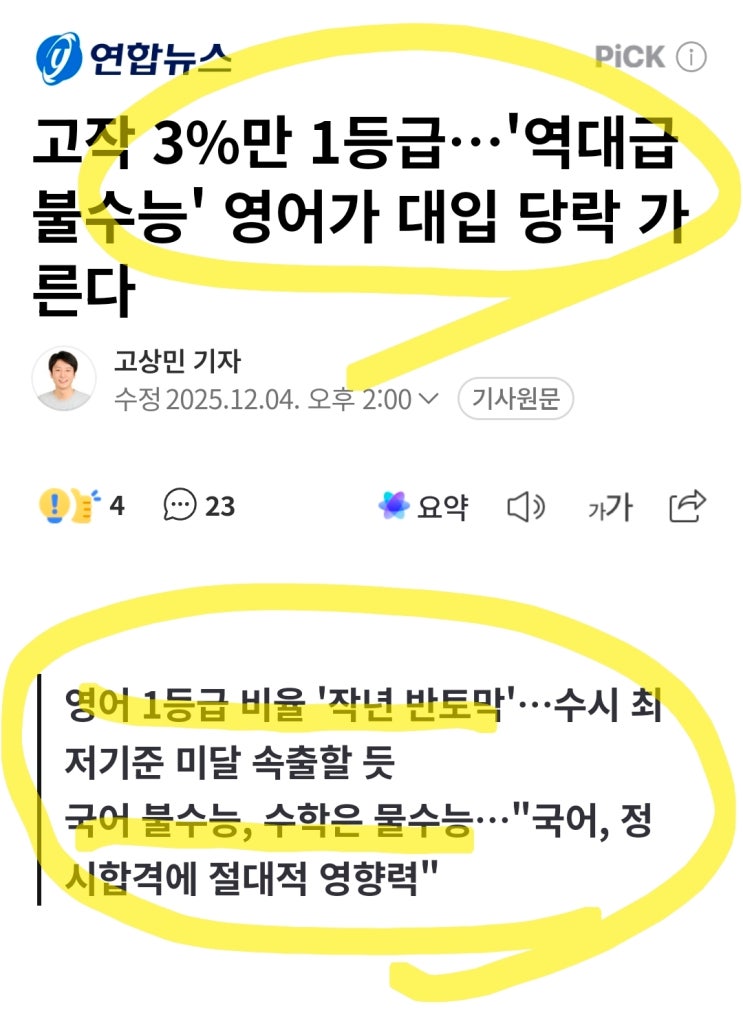 {공유} ◇연합뉴스 ◇영어 역대급 불수능, 1등급 고작 3.1%…"대입 핵심 변수는 영어"