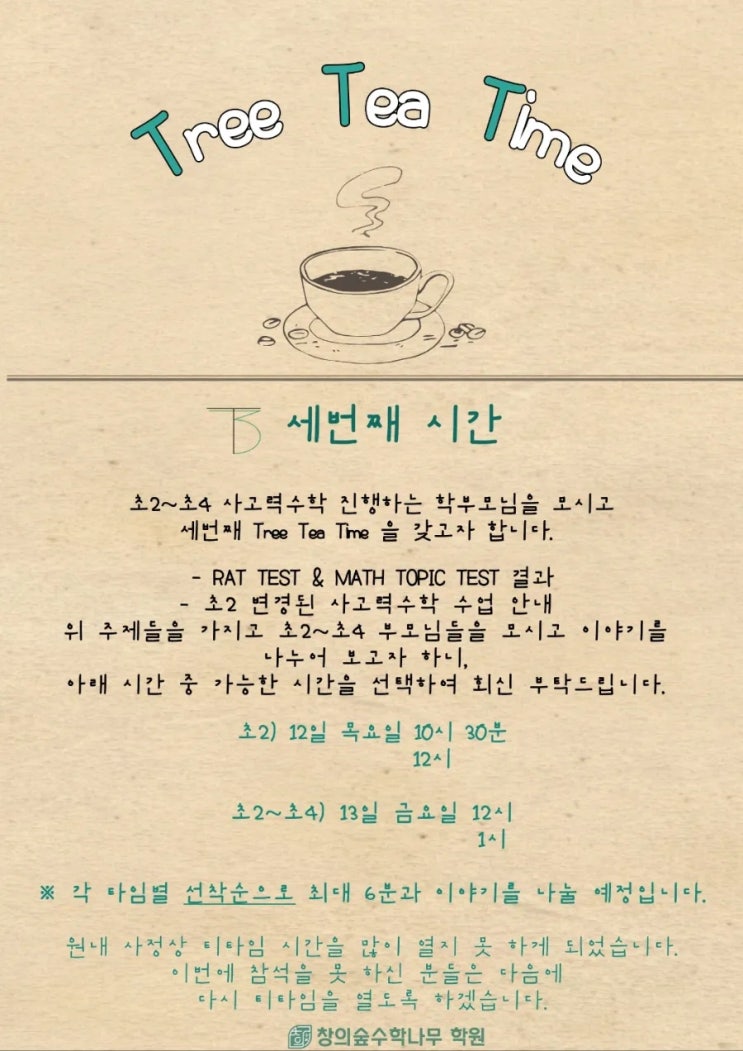 안녕하세요. 창의숲수학나무학원입니다. 이번에 초2~초4 사고력수학을 진행하는 학부모님들을 모시고 세 번째 Tree Tea Time 시간을 가졌습니다. 아이들의 학습 방향과 현재 학습 상태에 대해 차 한 잔 마시며 편하게 이야기 나누는 시간을 마련했습니다. 요즘 학부모님들께서 가장 많이 하시는 질문이 있습니다. “우리 아이 수학을 잘 하고 있는 걸까요?” “사고력수학은 언제까지 해야 하나요?” “문제집 많이 풀리는 게 좋은 건가요?” 이런 고민들을 가지고 계신 학부모님들이 많습니다. 그래서 이번 티타임에서는 아이들의 실제 학습 자료를 함께 보며 이야기를 나누었습니다. 이번 티타임에서 이야기 나눈 내용입니다. ✔ RAT TEST 결과....... <img src="https://blogthumb.pstatic.net/MjAyNjAzMTNfMjM1/MDAxNzczMzg3Nzg3NTQy.IiMbP65lIhiO321ku3dNkeT6XBnjIz53qnjat6Pm2Nog.t5W-VWsc4DzN9hBNu1jk7ogfNv2SE3WaHxRoKbiQa-og.JPEG/900%A3%DF1773386194680.jpg?type=s3" />