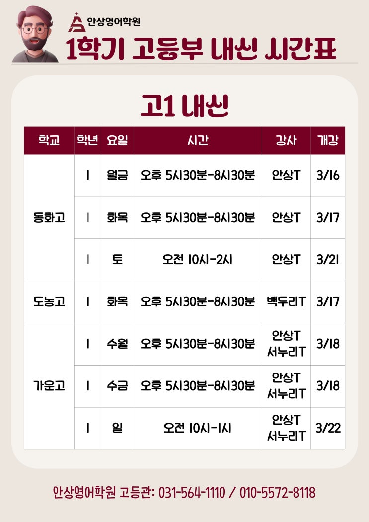 2026년3월16일 고1 내신 시작 ◆ 동화고 1학년 월금반: 오후 5시30분~8시30분 ◆ 동화고 1학년 화목반: 오후 5시30분~8시30분 ◆ 동화고 1학년 토요일반: 오전 10시~2시 ◆ 도농고 1학년 화목반: 오후 5시30분~8시30분 ◆ 가운고 1학년 수월반: 오후 5시30분~8시30분 ◆ 가운고 1학년 수금반: 오후 5시30분~8시30분 ◆ 가운고 1학년 일요일반: 오전 10시~1시 시간표의 각 학교별 시간을 참고하시어 접수 하시기 바랍니다. ** 상기 고등부 시간표는 학원 사정에 의해 변경될 수 있으며 신청 인원에 따라 폐강되는 반이 있을 수 있습니다. ** 고1 내신 문의 031-564-1110 010-5572-8118 https://blog.naver.com/asenglish/224177199929 https://blo....... <img src="https://blogthumb.pstatic.net/MjAyNjAzMTZfMjk2/MDAxNzczNjI5NzM1MzM2.YPn57hJtSmtdFCgjp2ilHFVWONp4VHga-bdKF28fCdog.Kg3GEVO9UbEqBDpTMDtzsg4WojqYEEBINLt6hU_FXD0g.JPEG/%B0%ED%B5%EE%B3%BB%BD%C51_%BD%C3%C0%DB.jpg?type=s3" />