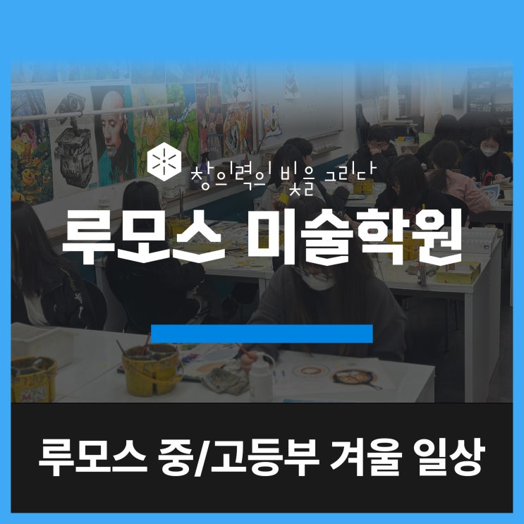 안녕하세요, 루모스미술학원입니다. 우리의 26년 겨울, 루모스 중등부/고등부반 학생들은 오전부터 학원에 도착하여 열심히! 실기력 향상에 신경을 많이썼던 겨울방학이 아닌가 싶습니다. ✏️ 왜 루모스미술학원일까요? - ✔️ 기초부터 탄탄하게 처음 시작하는 학생도 부담 없이 관찰력과 표현력을 자연스럽게 키워갑니다. ✔️ 입시까지 이어지는 커리큘럼 유치부/초등부 → 중등부 → 고등부/입시부 단계별 맞춤 수업으로 중간에 방향을 잃지 않도록 지도합니다. ✔️ 개별 맞춤 피드백 학생 한 명, 한 명의 성향과 실력에 맞춘 디테일한 피드백으로 실력 향상을 이끌어냅니다. 고등부는 기초디자인 / 애니메이션 기본 개체묘사와 구도에 집....... <img src="https://blogthumb.pstatic.net/MjAyNjAzMDNfMSAg/MDAxNzcyNTQwMjE3Mjkw.9-2IyPwxmF-4KNJvIM2r90JCLqVlzbrTF0aFEAnDAy4g.wI7TLEO0siqDdyxEMKX55-uBVkGB6935yQ5BY0SWwmYg.JPEG/%B0%DC%BF%EF%C0%CF%BB%F3_%B4%EB%C1%F6_1.jpg?type=s3" />