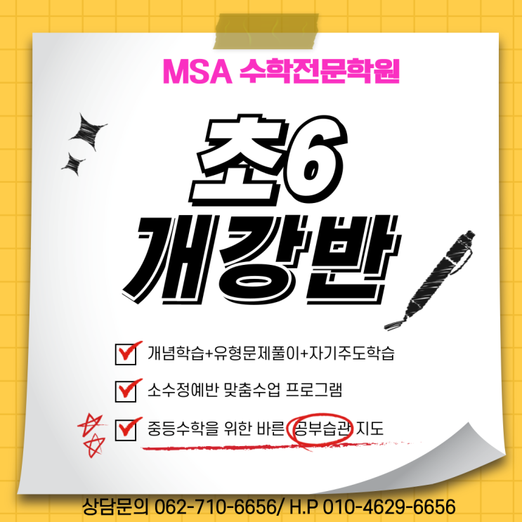 초 6 개강반 3월 개강 6-1 개념 시작반 월수금 6:00~8:00 초 5 개강반 3월 개강 5-1 개념 시작반 월수금 6:00~8:00 수강인원에 따라 요일.시간이 변경 or 개강 여부는 변경 될수 있음을 미리 안내 드립니다. 궁금하신 사항은 학원 OR 원장님께 문의주세요^^ 상담문의 학원 062-710-6656 원장님H.P 010-4629-6656 아이들이 계속 발전해 나갈수 있도록 재원생 한명한명 관심을 갖으며 사랑으로 지도하는 MSA 수학학원이 되겠습니다. 감사합니다. <img src="https://blogthumb.pstatic.net/MjAyNjAyMjVfMTcy/MDAxNzcyMDA0OTEyODQ2.alnaI_dTOQjgLx9fDzS7OzCMXBu0Ah1jMqTXOs7cPC8g.BO47hkTtvwzg4W8tVrkih5KuNPYM9W5TDfyzRgWdK4og.PNG/001.png?type=s3" />