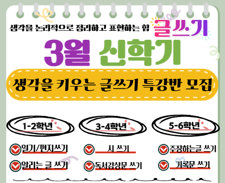 생각을 키우는 글쓰기, 지금 시작합니다 신학기가 시작되는 3월, 아이들의 학습 격차는 ‘글쓰기’에서 가장 먼저 나타납니다. ✔ 서술형 평가 확대 ✔ 수행평가 비중 증가 ✔ 독서활동 기록 강화 이제는 단순히 문제를 푸는 능력이 아니라 생각을 논리적으로 정리하고 표현하는 힘이 중요합니다. 눈높이 매곡학원에서는 신학기를 맞아 원장 직강 글쓰기 특강반을 개설합니다. ✍ 학년별 맞춤 글쓰기 과정 ■ 1~2학년 일기 쓰기 편지 쓰기 알리는 글 쓰기 문장 완성력과 표현력 기초 다지기 ■ 3~4학년 시 쓰기 독서감상문 쓰기 생각을 확장하고 감정을 구조화하는 훈련 ■ 5~6학년 주장하는 글 쓰기 기록문 쓰기 중학교 대비 논....... <img src="https://blogthumb.pstatic.net/MjAyNjAyMjdfMjEg/MDAxNzcyMTY0MDAzMjE5.W35KmUU79ugsb6IGoRcptGwirApGuADIGLSo2geQ-eUg.IcjOKgHGeMZnvfdrHc0t3YL5xSj6csEnPjfE0ZeaPQ8g.PNG/image.png?type=s3" />