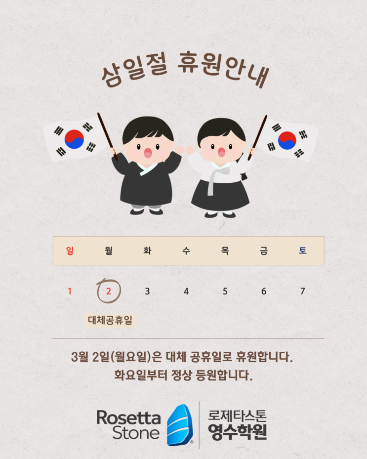 삼일절 대체공휴일 휴원 안내 신창동 로제타스톤영수학원