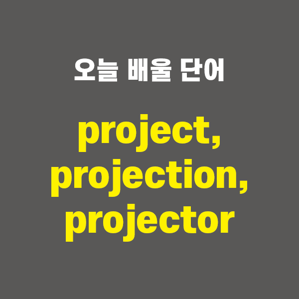 이번에 학습할 단어는 "project, projection, projector"라는 단어인데 이 단어들은 어원 [ject 던지다, 놓여있는]에서 만들어져요. 어원 [ject 던지다, 놓여있는]과 관련된 설명 그리고 접두사, 접미사와 관련된 설명은 "어원과 접사 설명서"를 참고해주세요. (아래 링크된 글을 통해서 어원에 대한 설명을 확인할 수도 있어요.) 어원 [ject 던지다, 놓여있는] - 참고 번호 216번 project 뜻 : 투영하다, 발사하다, 예상해서 산출하다, 튀어나오다 (동사) 과제, 계획된 사업 (명사) 발음 : [p 프 rɔ 로 dʒek 젝 t 트] [pro 앞으로] + [ject 던지다, 놓여있는] 빛을 앞으로[pro] 던져서[ject] 스크린에 이미지가 나타나게....... <img src="https://blogthumb.pstatic.net/MjAyNTEyMTlfMiAg/MDAxNzY2MTA2MjE3MDk5.rnvQbKSg1PVNKMYhh-23vCWP4BkuCACE8uXEECCHyNgg.zTjThCqamVJ1ewZdbVja8-90eKsLUG2znKb-PQg-5rgg.PNG/project_projection_projector.png?type=s3" />