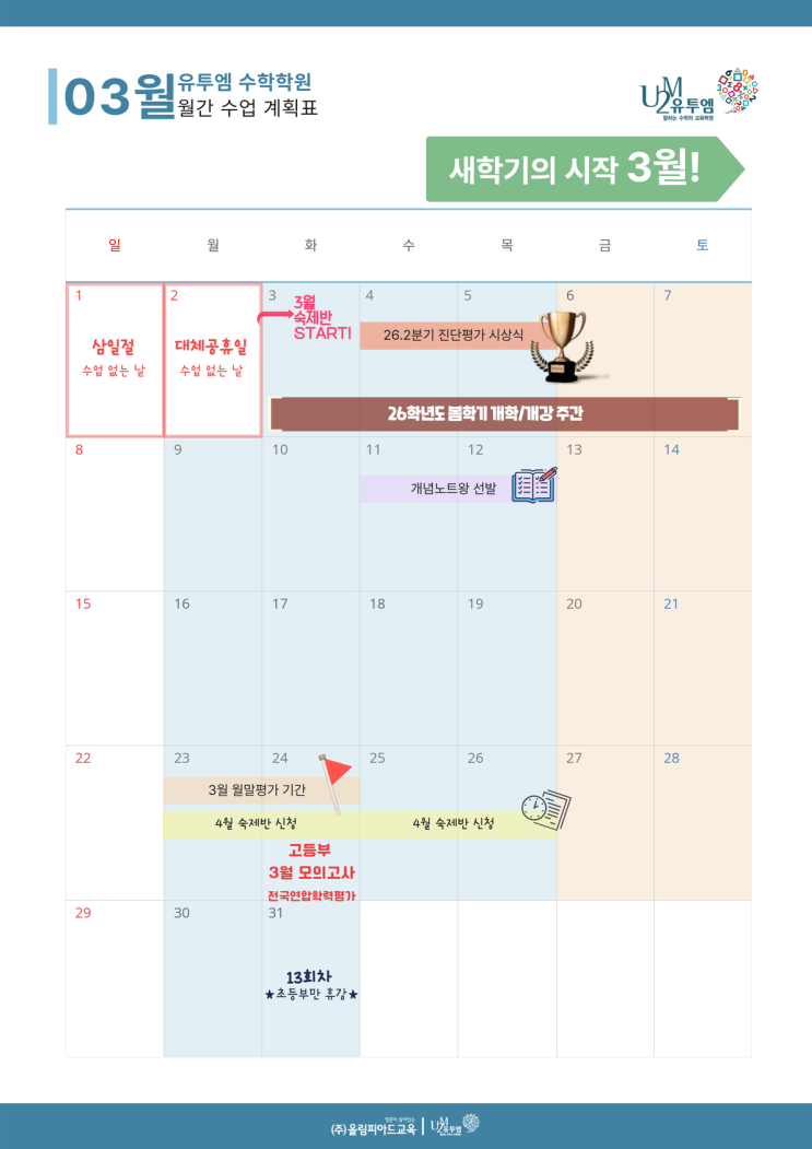 26년 3월 일정표 안내 분당서현 수학학원 유투엠