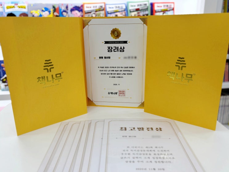 책나무 전국 글쓰기 대회 광명 철산점 3명 장려상 수상! 그 과정에서 아이들이 보여준 성장은 무엇이었을까요? 지난 11월 전국 책나무 학생들을 대상으로 독서 감상문 대회가 열렸습니다. 1년에 한 번 열리는 전국 책나무 대회인만큼 많은 학생들이 참가했는데요. 저희 광명 철산 책나무에서도 1학년부터 6학년까지 총 10명의 아이들이 전국 글쓰기 대회에 도전했습니다. 그 노력의 결과, 3명이 '장려상'을 수상했습니다~!! 그 외에도 끝까지 최선을 다해 참여한 모든 책나무 친구들에게 '최고발전상'을 주어 칭찬해주었습니다~!! 상의 크기가 중요한 것이 아니라 이 과정을 통해 키워낸 경험이 소중하고 귀한 것이니까요 ^^....... <img src="https://blogthumb.pstatic.net/MjAyNTEyMTVfMzYg/MDAxNzY1NzgyODY1MzA4.2-2mllgXLTLwS5LFFM_cgeNFm-RKZyN9q2t5KjnbJeAg.3Zh9O0COnSrKr08eeOhbDjHTp-fYdjbJMKLJEVpEXFEg.JPEG/KakaoTalk_20251202_142506578.jpg?type=s3" />