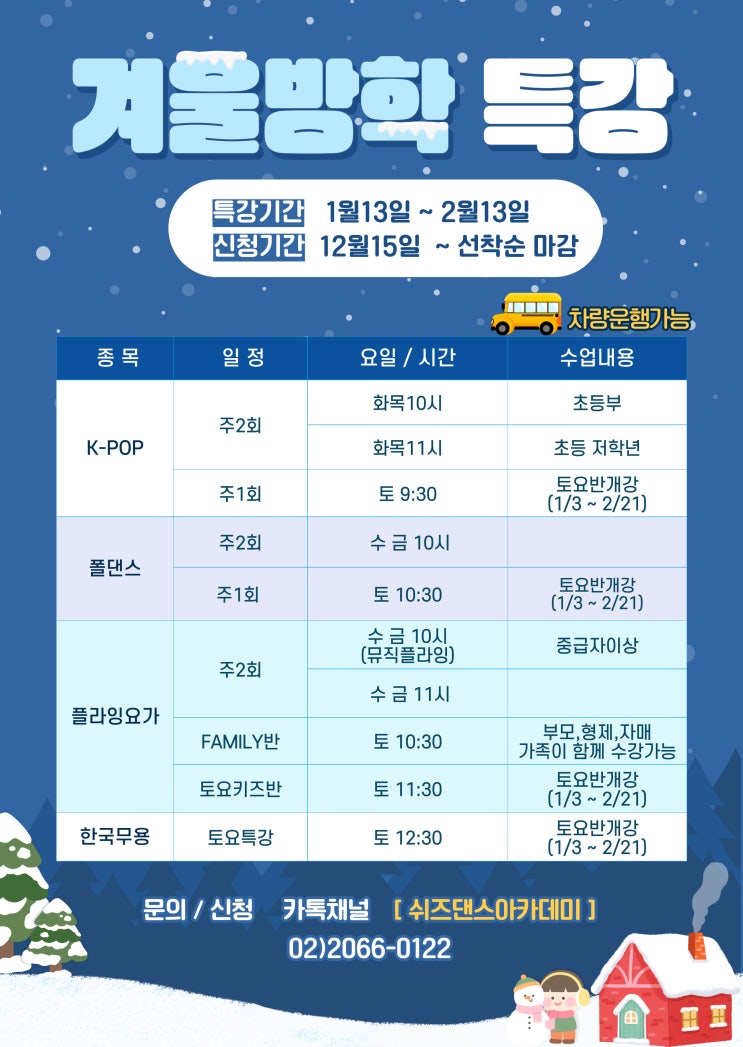 ☃️겨울방학특강☃️ 드디어~!! 기다리고 기다리던 쉬즈댄스아카데미 ❄️겨울방학❄️특강소식입니다~!!☃️☃️ 긴 겨울방학을 그냥 보낼 수 없지!! 체력!! 자신감!! 집중력!! 즐거움!! 까지 한번에 키우는 겨울방학 특강~!! 방학특강기간 1/13~2/13 (토요일반 1/3개강 ~2/21) ✨️ 케이팝 화목10시 화목11시 토 9:30 ✨️ 플라잉요가 수금 10시 (뮤직플라잉) 수금 11시 토 10:30 (패밀리 플라잉요가) 토 11:30 ✨️ 폴댄스 수금 10시 토 10:30 ✨️ 한국무용 토 12:30 방학특강 차량운행가능 (차량비 별도) ✅️ 문의/신청 카톡채널 [쉬즈댄스아카데미] ✅️ 02)2066-0122 ▼▼신청서 작성 ▼▼ <img src="https://blogthumb.pstatic.net/MjAyNTEyMThfMjc0/MDAxNzY2MDU3MTkwOTc3.IzwIQVf6oMKkWz80hwS5PJ5WDmVYs_Ml_Y8RfN_SOl4g.CJEIdlkbPbqh9ICIzOSRR532MX0na4mR5cngAbR7cE0g.JPEG/001.jpg?type=s3" />