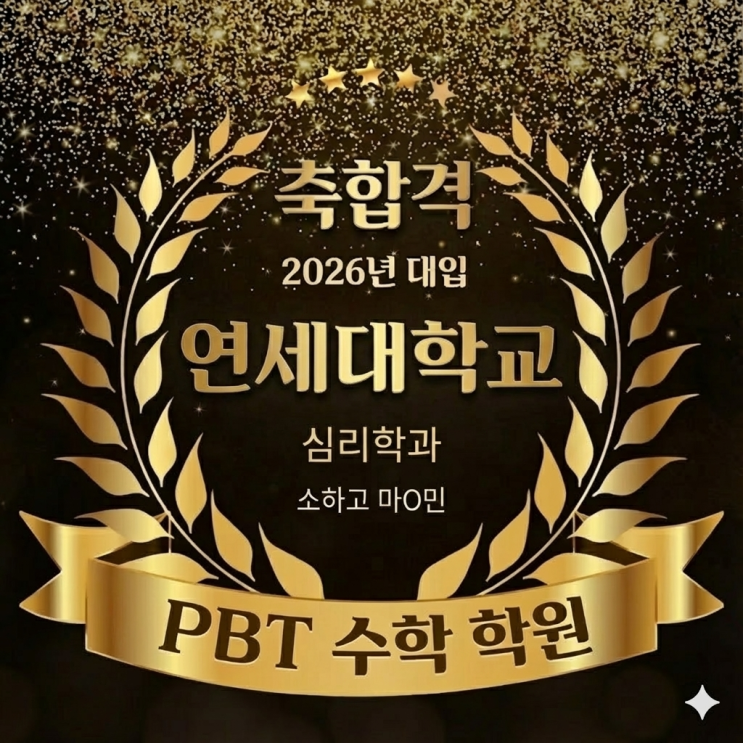 안녕하세요, PBT수학학원 입니다. 오늘은 정말 가슴 벅찬 소식을 전해드리려 합니다. 지난 3년 동안 PBT에서 그 누구 보다 성실하게 공부했던 소하고 M학생이 연세대학교 심리학과에 당당히 합격했다는 소식입니다! 단순히 '좋은 대학에 갔다'는 사실보다, M학생이 보여준 성장 과정이 너무나 아름 답고 감동적이기에 그 이야기를 살짝 들려드리고 싶습니다. 수학이 너무나 두려웠던 시작 사실 M학생은 다른 과목에 비해 유독 수학을 어려워하는 학생이었습니다. 고등학교 1학년, 설레는 마음으로 시작했던 첫 학기. 하지만 받아든 수학 성적표는 M학생이 원하던 점수와 등급이 아니었습니다. 노력에 비해 결과가 나오지 않....... <img src="https://blogthumb.pstatic.net/MjAyNTEyMTlfMTQy/MDAxNzY2MTUwMTIzMDM1.sjcQfaA7MQgmgoPk4hgxTUt7IG86EDLNN0XCvZtSFbEg._P2QmxLflY6pdburR4xC68ZWVeT-a9A6FEqw1YsKVYIg.PNG/%BF%AC%BC%BC%B4%EB_%BC%D2%C7%CF%B0%ED.png?type=s3" />