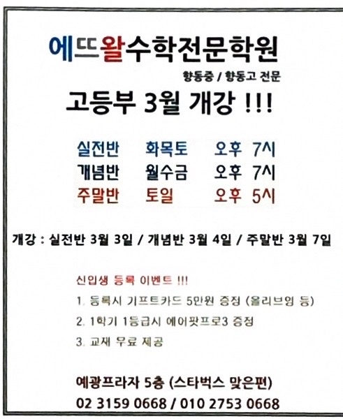 ★ 예비고1 통합사회 개강 ★ 3월 새 학기를 앞두고, 통합사회 개강 소식을 알려드립니다! 통합사회의 내신 이수 학점은 국영수와 유사한 수준의 단위로 편성되어 있어, 비중이 결코 가볍지 않습니다! 여기에 더해, 2028학년도부터는 수능에서도 전 학생 필수 응시 과목이 됩니다. 더 이상 선택이 아니에요. 피할 수 없다면, 미리 잘 준비하는 것이 최선입니다. 쏘쿨에서는 성균관대학교 인문학부 출신 선생님이 직접 수업을 진행합니다. 개념부터 실전 적용까지, 내신과 수능을 함께 준비할 수 있는 커리큘럼으로 진행하니, 통합사회에서 1등급을 놓치지 않고 싶은 학생들은 쏘쿨과 함께 해요! 수업 일정 (3월 5일 개강) 목: 오후 7:00~9:3....... <img src="https://blogthumb.pstatic.net/MjAyNjAyMjJfMTI2/MDAxNzcxNjk0MDE2NzQ0.-zxKf7q_hDgjIWjimgBZpEaGZyaKQtx9BpCgNPboWewg.tgdw-nJT3cdhtucsGqvnyZdNs-xjwROawsGFnGgDBDsg.PNG/image.png?type=s3" />