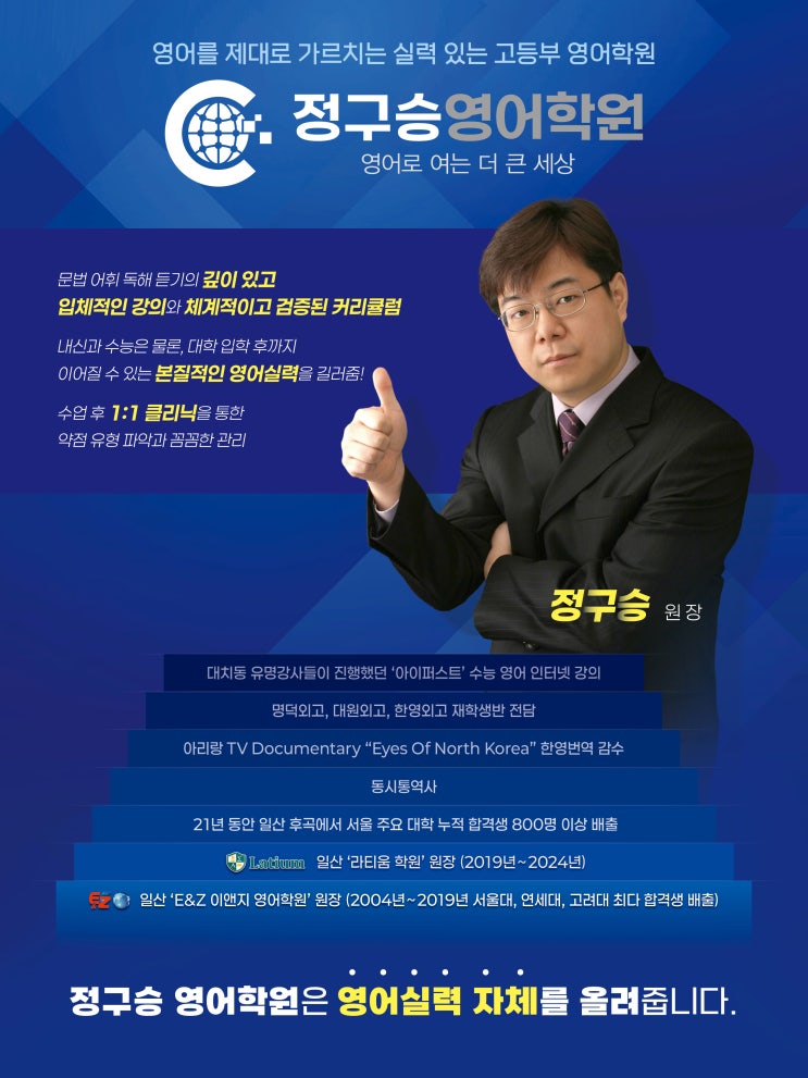 ▶모든 수업의 최종적인 목표는 대학 입시입니다. 하지만, 학년별로 학생별로 준비하는 과정이 다릅니다. 25년 이상의 강의와 입시 지도의 경험을 바탕으로 학생들에게 맞춤별로 학습 목표를 세우고 수업이 진행됩니다. ▶ 무엇보다 중요한 것은 학생의 의지입니다. 좋은 결과와 만족도를 학생과 함께 만들어 나가도록 노력하겠습니다. ▶ 반드시 좋은 결과를 약속드리기 위해 별도의 관리시스템 도입합니다. ▶ 관리시스템 (복습동영상 제공, 과제 수행여부 – 테스트로 확인, 질문 피드백) ⇒ 각 단계에서 개별적으로 확인합니다. ⇒ 학생별로 맞춤 지도를 통해서 단점을 보완하고 장점을 극대화하도록 하겠습니다. #대송중학교 #호곡중학교 #한....... <img src="https://blogthumb.pstatic.net/MjAyNTEyMTBfMiAg/MDAxNzY1MzU1NDAyNTI2.Fbc-r90lGs8n6qmhVPFVGzviNeabj-SU_TW8kDauTn0g.5LQRJC0vw6zxUxEcJPg1_XQbl5Clq8Fyas1RIYpO8rAg.PNG/25%B3%E2_%B0%DC%BF%EF%B9%E6%C7%D0.png?type=s3" />