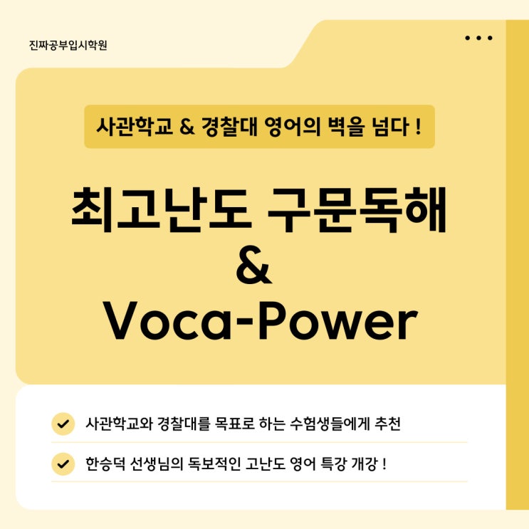 안녕하세요, 일산 진짜공부입시학원, 진공입니다. 사관학교와 경찰대를 목표로 하는 수험생 여러분, 수능 영어 1등급을 받는다고 해서 사관학교 영어 시험이 쉬울까요? 정답은 "절대 아니다"입니다. 사관학교와 경찰대 영어는 수능보다 훨씬 방대한 어휘량, 복잡한 구문, 그리고 빡빡한 시간 배분을 요구합니다. 수능 영어 상위 3%의 벽을 넘어서는 진짜 실력이 없다면, 1차 시험 합격은 멀어질 수밖에 없습니다. 이 높은 벽을 단숨에 허물어뜨릴 영어 전문가, 한승덕 선생님의 독보적인 고난도 영어 특강이 이번 겨울방학 여러분을 찾아갑니다. 강의 개요 및 일정 강좌명: 최고난도 구문독해 & Voca-Power 강사: 한승덕 선생....... <img src="https://blogthumb.pstatic.net/MjAyNTEyMDlfMjgw/MDAxNzY1MjYzNzI4MzIz.gYQI62HN3AprYdmGxe6cd0QfZO1mkGWjhCelPNSZzqEg.DE1jQbl5TP4BhUolCOTI6l8ZgqJpxo5lSkexjl0NVCog.JPEG/001.jpg?type=s3" />