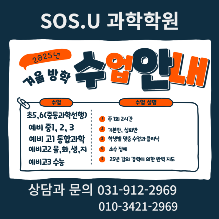 후곡 소수과학학원 - 겨울방학 초등과학, 중등과학, 고등과학 수업 안내