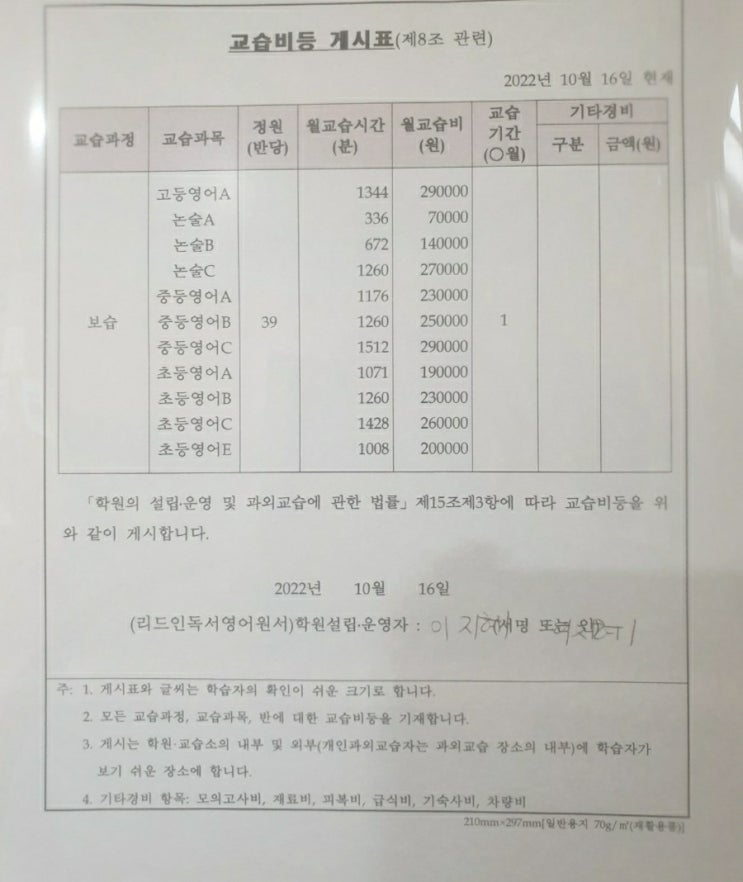 교습비 안내