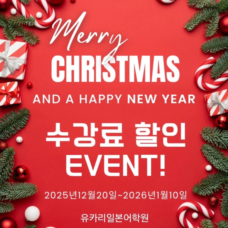 ✨️Merry Christmas & Happy New Year 수강료 할인 event!!✨️ 수강료 5%할인!! 기간 : 2025.12.20~2026.1.10 대상 : 신기 학생 , 재학생 ㅡㅡㅡㅡㅡㅡㅡㅡㅡㅡ 안녕하세요 . 유카리일본어학원입니다. 크리스마스과 새해를 맞이하여 항상 관심과 사랑을 많이 주시는 여러분이 조금이라도 웃음꽃이 필 수 있도록 수강료 할인이라는 아주 작은 선물을 준비 했습니다 많은 관심을 부탁드립니다 감사합니다. ^^ 유카리일본어학원 02-595-1582 카톡: yukarijp1582 #왕초보 #일본어기초 #일본어회화 #JLPT #일본유학 #일본워홀 #원어민강사 #일본여행 #서울일본어학원 #YUKARI日本語学院 #ゆかり日本....... <img src="https://blogthumb.pstatic.net/MjAyNTEyMjBfMjgz/MDAxNzY2MTkwMzkzMzg5.vFhtiSof-tL3VgpdDPgzt6YgqHmoXtAFX1mAx9tPimog.YFCyVNbIW60SiOMvjQoo2zwSjRj8gjwVJoff6m-aNzYg.JPEG/900%A3%DFIMG%A3%DF20251220%A3%DF091914%A3%DF585.jpg?type=s3" />
