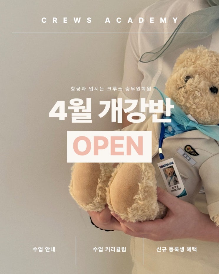 안녕하세요 크루쓰 승무원학원입니다:) 항공과 입시를 준비하는 학생들에게 새로운 시작을 알리는 4월 개강반이 오픈되었습니다. 크루쓰 승무원학원은 학생 한 명 한 명의 가능성을 발견하고 자신만의 강점을 찾아가며 입시를 함께하는 곳입니다. 이번 4월 개강반은 항공과 입시를 처음 준비하는 학생들도 차근차근 성장할 수 있도록 커리큘럼을 구성했습니다. 수업 일정 4월 18일 (토) 개강 매주 토요일 11:00 ~ 14:00 (3시간 수업) 주 1회 진행 소수 정예 수업으로 진행되기 때문에 학생 개개인의 특징과 강점을 세밀하게 파악하며 지도합니다. ✔ 각 반 최대 8명 소수정예 수업 ✔ 선착순 등록으로 조기 마감 가능 ✔ 마감 시 5월 개강반....... <img src="https://blogthumb.pstatic.net/MjAyNjAzMTJfMTM2/MDAxNzczMjg5MzU5ODMx.iVfhslK9BcBuIjjaZRYelBCkOsX9y5_5EpSt51nH2v4g.fmwYMuwxhcBTxaOkxlmfg0J0sh41MgEALtNkD-zL1aIg.JPEG/1.jpg?type=s3" />
