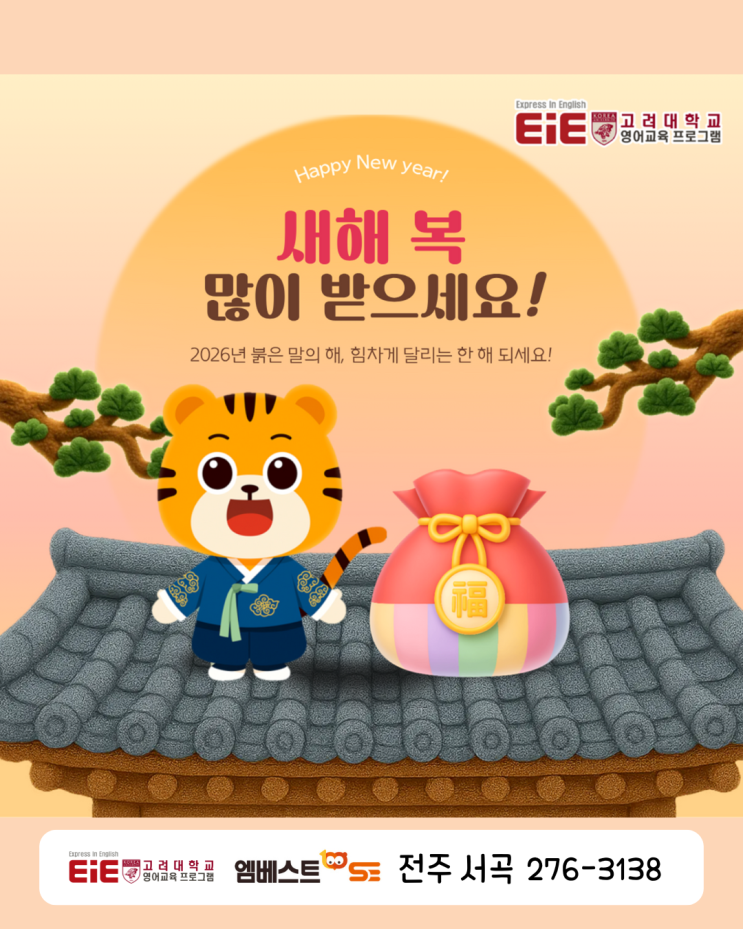 2026 구정 인사 및 설연휴 휴무 안내드립니다 (Lunar New Year / Korean New Year) 안녕하세요. EiE x 엠베스트se 전주 서곡캠퍼스 원장입니다. 우리나라의 설날은 영어로 Lunar New Year 또는 Korean New Year 라고 표현합니다. 달의 움직임을 기준으로 한 새해라는 의미를 담고 있는 명절이죠. 이와 관련하여 2026년 설 연휴 학원 휴무 일정을 안내드립니다. 2026 설 연휴 휴무 일정 2026년 2월 16일(월) ~ 2월 18일(수) 총 3일간 휴무 ✔ 수업 휴강 ✔ 2월 19일(목) 정상 수업 재개 아이들에게도 설날은 단순한 ‘연휴’가 아니라 가족과 함께 보내며 문화를 느끼는 소중한 경험의 시간입니다. EiE 전주 서곡캠퍼스는 아이....... <img src="https://blogthumb.pstatic.net/MjAyNjAyMDlfNTcg/MDAxNzcwNjQ1MjIwMDQx.MVawQuawr2ojbq_myCXooURI6QGZpQEsfK9APDzACb8g.QMroix6H2P0sgFFbLpYejd7vc-xtGKTuWq2m_AnPG0og.PNG/1.png?type=s3" />
