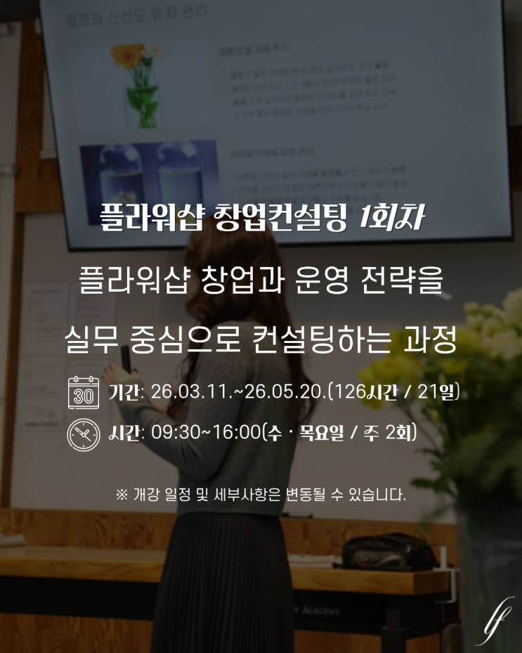 년도 플라워샵 창업컨설팅 1회차 과정 안내 ✨ 꽃길 걷는 사장님이 되는 법, 창업 컨설팅 A to Z ✨ 년도 플라워샵 창업컨설팅 1회차 과정 안내드립니다〰️ 기간: 26.03.11.~26.05.20.(126시간 / 21일) ⏰ 시간: 09:30~16:00(수ㆍ목요일 / 주 2회) ※ 개강 일정 및 세부사항은 변동될 수 있습니다. 전문 플로리스트로의 도약을 위한 체계적인 비즈니스 훈련 과정 시장 경쟁력을 갖춘 브랜드 기획부터 매장 운영 전반에 필요한 핵심 실무 역량을 통합적으로 학습합니다~ 꽃으로 시작하는 두 번째 인생, #림스 에서 제대로 준비하고 시작하세요! 2026 림스꽃예술학원 강의 일....... <img src="https://blogthumb.pstatic.net/MjAyNjAyMjVfMTAx/MDAxNzcyMDA4ODM3NjYy.unbxzEFS9cJTprkLcuiCRy770zb5EOCOn3QtCKhOwUAg.u_jQ_qj4H9UZ5FkcmjrLh5Darj7TzKV1VgSbx0-5Lucg.PNG/10%C7%C3%B6%F3%BF%F6%BC%A5%C3%A2%BE%F7%C4%C1%BC%B3%C6%C3.png?type=s3" />