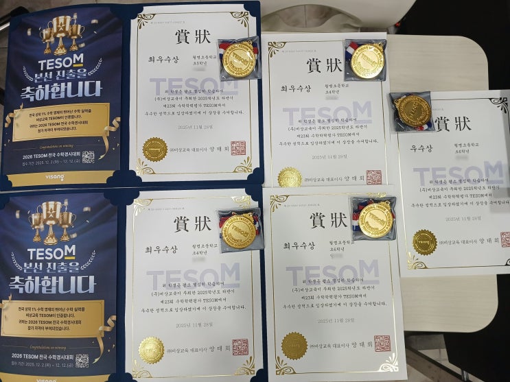 안녕하세요. 일품수학 삼성영어셀레나(수송학원)입니다. 이번 수학 경시대회에서 우수한 성적을 얻은 학생들이 배출되어서 조금만 자랑(?) 해보려고 합니다.^^ <결과는 최우수상이 무려 4명 우수상은 1명> 대단한 건 이중 2명 친구가 전국 상위 1% 수학 영재의 뛰어난 수학실력을 인증받고 2026년 전국 수학경시대회 진출권까지 획득했다는 너무나도 대견하고 기쁜 소식입니다. 경시대회를 보기 전 시험 준비를 하며 힘들어 하는 모습을 보면 안쓰러워보였던 순간도 있었는데 이렇게 좋은 결과를 얻으니 학생들도 뿌듯해 하고 저또한 너무나도 보람이 느껴지더라구요^^ 부모님들까지 기뻐해주시니 정말 뿌듯했습니다~ 이번을 계기로 수학이....... <img src="https://blogthumb.pstatic.net/MjAyNTEyMjBfNjIg/MDAxNzY2MTU4MzA3MzY1.PvT-DmEeeMyIO_OKBuhf4PDUdp8DdThaYQrn6fjNQN0g.iGgIduMq_2wMzzivwqcDuLwH9Qa0sptCBzvQKX3Y_PAg.JPEG/KakaoTalk_20251220_002421535.jpg?type=s3" />