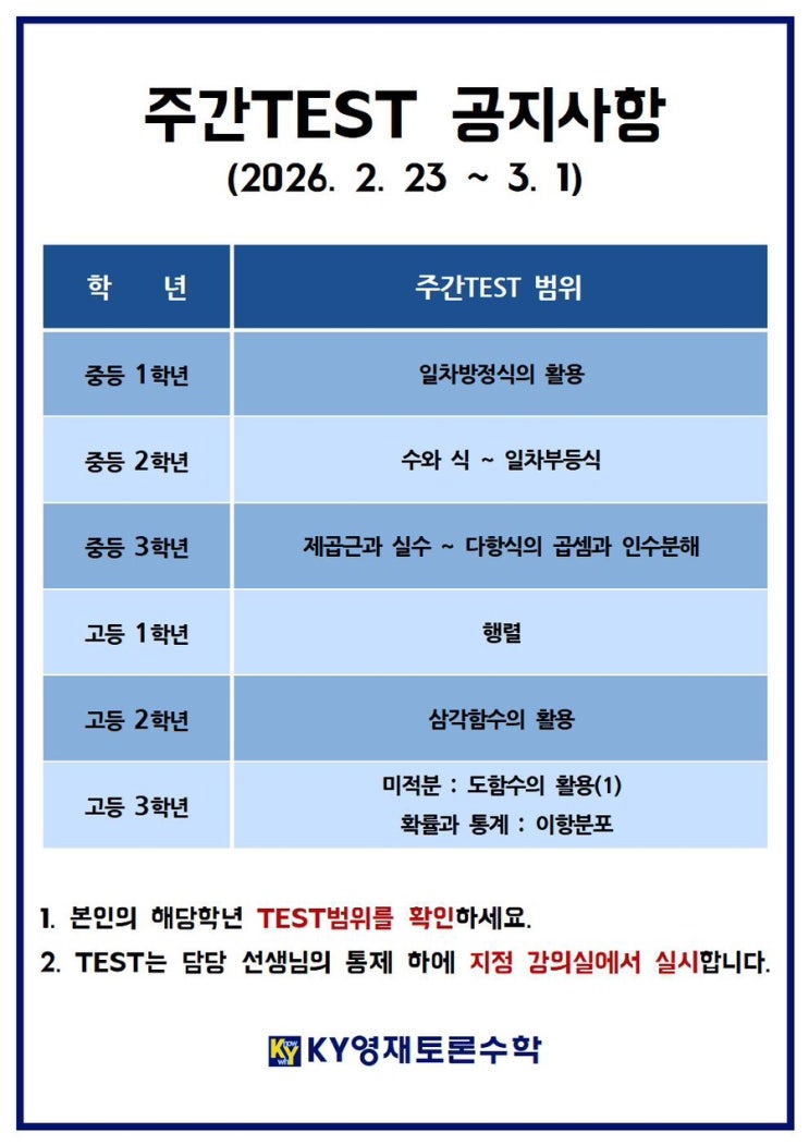 2026년 2월 4주차 주간테스트 공지사항