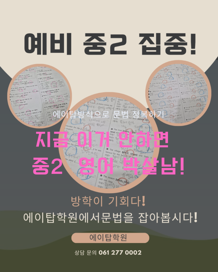 안녕하세요. 에이탑 학원 수진쌤입니다. 지금 예비 중2인가요? 이제 중2가 되는 학생의 학부모님이신가요? 다음 학년을 준비하는 겨울방학은 정말 중요한 시기입니다. 방학이 끝나고 개학을 하고 나면 자기와 비슷한 성적이었던 친구들이 엄청나게 실력이 올라와 있을 때가 많죠. 그만큼 방학이라는 기간을 어떻게 보내느냐에 따라서 다음 학년의 성적에 엄청 큰 차이가 납니다. 지금 예비 중2라면, 그리고 영어를 잡아야 한다면 지금 딱 이시기에 문법을 잡아야 합니다. 이제 중2부터는 고급 문법이 시작이 됩니다. 문장의 구조를 복잡하게 만들고 해석도 어려워지는 문법들이 시작이 됩니다. 1학년 때 쉽게 느껴지던 영어가 어려워집니다. 학년....... <img src="https://blogthumb.pstatic.net/MjAyNTEyMjBfNDkg/MDAxNzY2MjM0MTM0NjU2.JEOoYwywb2GcKErPCN0VJu_rceIF5kZqbzsLliM_dNAg.w_G8AS-hFLIblP-Lu62RKcvJFufgRInu75LoYSqnv6Yg.PNG/900%A3%DF%B0%DC%BF%EF%B9%E6%C7%D03%B0%B3%BF%F9_%BF%CF%A4%B5%B4%D7%B9%DD%B0%AD%A3%DF20251220%A3%DF213414%A3%DF0001.png?type=s3" />