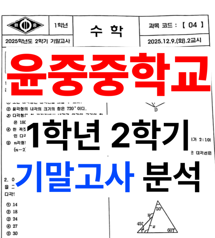 안녕하세요. 김정은수학 꿀벌군단 학원입니다. 이번 포스팅은 윤중중학교 1학년 2학기 기말고사 분석입니다. 아이들이 느끼는 체감난이도가 그리 높지 않았을것으로 생각되는데요. 한번 자세하게 살펴보겠습니다. 총평 25년도 윤중중 1학년 2학기 기말고사는 중 정도로 평가합니다. 평면도형: 다각형의 내각/외각의 성질을 묻는 문제들이 다수 출제되었습니다. 단순히 공식을 암기하는 것을 넘어, **오목다각형(6번)**이나 **내/외각의 합(3번, 5번)**을 유연하게 볼 수 있는 시각이 필요했습니다. 입체도형: 변별력은 후반부 입체도형의 겉넓이와 부피 계산에서 결정되었습니다. 특히 원뿔대(20번), 잘려진 정육면체(21번), 구와 원기둥의 부피....... <img src="https://blogthumb.pstatic.net/MjAyNTEyMjBfOTYg/MDAxNzY2MTkyMjEwNDg1.MpJvOPL8wuYQhoc7cM74_VtSEE8Kvt8gefKxr9ySwUIg.eO7BjG2wYDjafxfFQgdeVAi3z7JeFVcdJg-LLJBCWkQg.PNG/%C1%A6%B8%F1%C0%BB-%C0%D4%B7%C2%C7%D8%C1%D6%BC%BC%BF%E4_-003.png?type=s3" />
