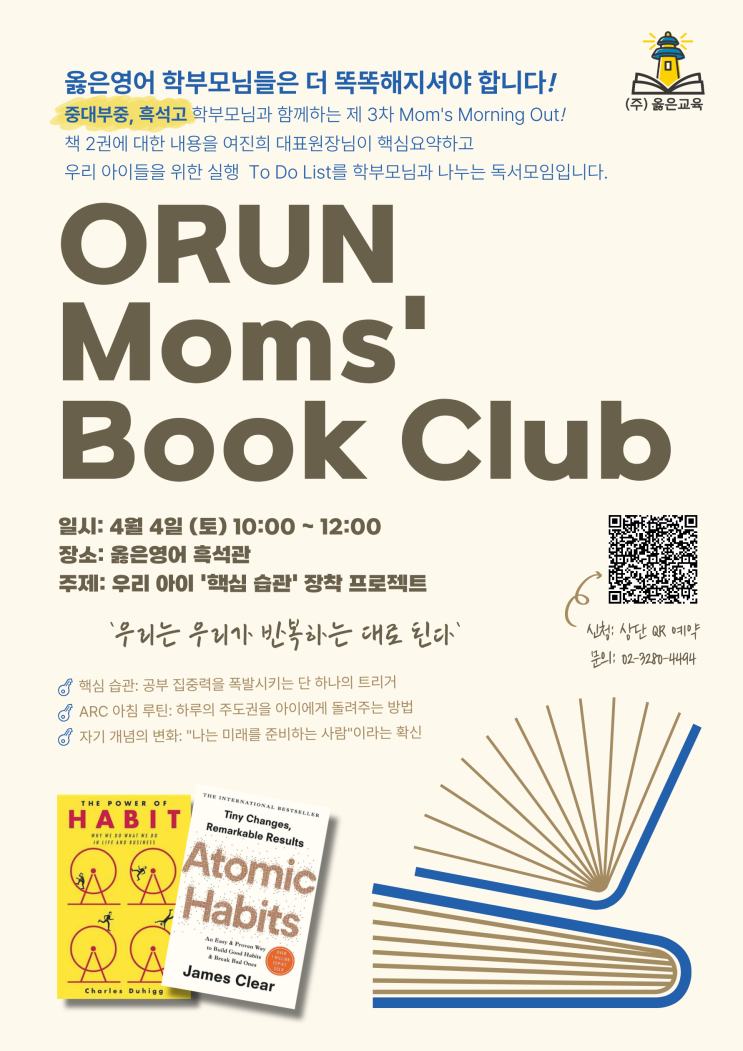 ✨중대부중·흑석고 학부모님을 위한 'Mom's Book Club' (4/4) ✨ 안녕하세요, 옳은영어 흑석관입니다! 동작구의 교육 열기를 몸소 증명해주시는 중대부중과 흑석고 학부모님들, 요즘 아이들 교육 고민 많으시죠? 영어 선행, 독서 관리, 문해력, 그리고 정교한 루틴 설계까지. 사실 우리 학부모님들은 이미 ‘무엇을 해야 하는지’ 너무나도 잘 알고 계십니다. "아는 것과 실행하는 것의 간극" 지금은 정보가 부족해서 못 가르치는 시대가 아닙니다. 오히려 학부모님들은 이런 질문을 더 자주 던지십니다. "이렇게까지 서포트하는데, 왜 아이 성적은 기복이 심할까요?" "철저하게 계획을 세워줘도 왜....... <img src="https://blogthumb.pstatic.net/MjAyNjAzMTJfMTcw/MDAxNzczMjk4MDkxMzU1.cyysNKyFGHHbhjh6OJrKD9JSsJeKbbeE3RiiBsBNWPcg.7dcJm116wWzyet2ckY_XxhDNxOBze1Y-kuxAgwH8zLUg.PNG/Mom%27s_Morning_Out_%282%29.png?type=s3" />