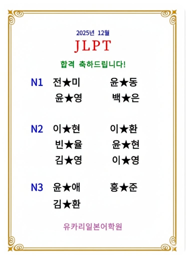 JLPT 합격 축하드립니다!! 작년12월에 JLPT 일본어능력시험 결과가 나와서 저희 학원생도 많이 합격 하셨습니다!! 정말 열심히 공부하시는 결과입니다! 우리 학원생분들!! 정말 멋있습니다!!✨️ 합격 축하드립니다!! ㅡㅡㅡㅡㅡㅡㅡ 유카리일본어학원 02-595-1582 카톡: yukarijp1582 #기초일본어 #일본어회화 #원어민강사 #JLPT #유카리일본어학원 #서초구 #방배동 #서울일본어학원 #일본워홀 #일본유학 #ゆかり日本語学院 #YUKARI日本語学院 <img src="https://blogthumb.pstatic.net/MjAyNjAyMjVfMTc4/MDAxNzcyMDIzOTA4MDgy.JvY504X0kmwDrHK6QBjI-vgFw1z7swt-4nK56Bv2SAMg.VhTqMmwrpx-nnNlBX_Oi6Qm4Etw09jOgE08zEMfMDlgg.JPEG/Screenshot%A3%DF20260225%A3%DF211430%A3%DFGoogle.jpg?type=s3" />