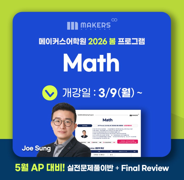 AP Math 봄방학 특강 및 AP시험대비 실전문제풀이반 개강! 20년 강의 경력 Joe쌤의 ❝2026 AP Calculus 변화에 맞춤 적용된 실전문제❞로 완벽 대비! ● AP Precal ● AP Cal AB ● AP Cal BC 수강생들을 위한 Joe 쌤 수업 혜택! AP 시험대비반 수업 특징 ✳️ 1일 1회 Full Test로 실력 향상! ✳️ 시험 적중률이 높은 실전문제 위주 수업 (최다 실전문제 보유) → 실전문제풀이 후, 약한 부분 집중 복습, 숙제와 오답노트 필수! → 5월 시험대비 - 전체 커리큘럼 수강 후, 숙제 오답 100% 제출시 5점 보장! → 25년 수강 학생들 폭발적인 반응! 2026년 문제유형 적중률도 최고! → AP Test 문제, 답지 & 풀이 과정 제공 ✳️ 1:1 맞춤....... <img src="https://blogthumb.pstatic.net/MjAyNjAyMTRfMTc3/MDAxNzcxMDQ3ODQ2NjM5.VM5UWPeeP4lajaaiuIXOT7A-OHts1B1K-gYNLM4W31Ug.FKHZzS_JL7ohUINDxmtpZ9TapSI3W5B5kBEUpVagl7Eg.JPEG/KakaoTalk_20260214_124649757_08.jpg?type=s3" />