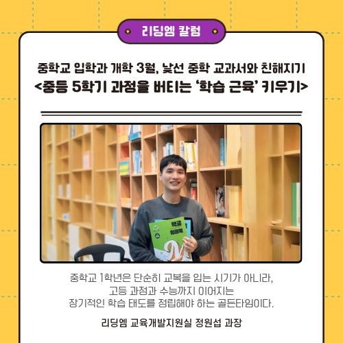 안녕하세요! 초등학생과 중학생을 위한 독서논술 학원 책읽기와 글쓰기 리딩엠 입니다. 중학교에 입학하면 많은 학부모님들이 가장 먼저 고민하는 것이 있습니다. 선행을 얼마나 해야할까요? 문제집은 어떤 걸 풀려야 할까요? 하지만 실제 학교 현장에서 학생들의 성적을 가르는 기준은 "교과서를 읽고 이해하고 정리하는 힘"에 있습니다. 오늘 교육 칼럼에서는 중학교 성적을 좌우하는 교과서 중심 학습과 독서력의 중요성에 대해 이야기해보겠습니다. 중학교 입학과 개학 3월, 낯선 중학 교과서와 친해지기 <중등 5학기 과정을 버티는 ‘학습 근육’ 키우기> 새로운 시작의 설렘과 긴장이 교차하는 3월, 초등학교의 울타리를 벗....... <img src="https://blogthumb.pstatic.net/MjAyNjAzMTdfMjk3/MDAxNzczNzMwOTgyNDY2.qwb2yxf37G8TCTTufAdyQCvvppGMPSPsyo6qeJxKCPMg.mhfWKGqN-Y0ekJG6AJlTmokmMOtsVoa2n3-qZYhVY6kg.JPEG/1.jpg?type=s3" />